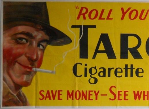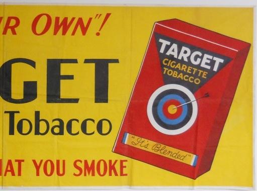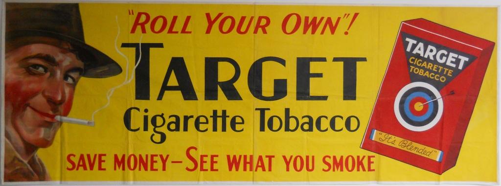 Here we have a large canvas banner advertising Target Cigarette Tobacco from Brown & Williamson Tobacco Corp. of Louisville, Kentucky. The size is 118 inches wide x 43-1/2 inches tall. The colors are bright and crisp. It has an artist signature / stamp in the bottom left corner. This looks like it was never used and will be very easy to mail, as it is canvas and can be folded.