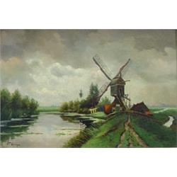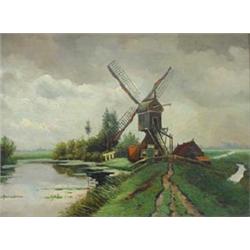 Canvas, Windmill in landscape, in the style of P.P. Schiedges, signed b.l., dim. 36 x 54 cm. …