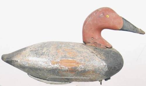 Canvasback drake decoy from the Susquehana River area with a working head replacement on an old body. Partial brands on the bottom, "Vanden-" and "Disst". Very old paint, nice form. (decoy)