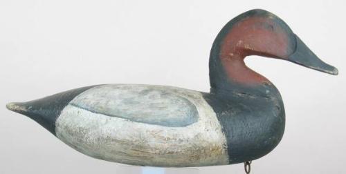 Canvasback drake with carved eyes and a rounded bottom. Paint appears to be mostly OP with t/u on the black areas and wear overall. Narrow check on the back. (decoy)