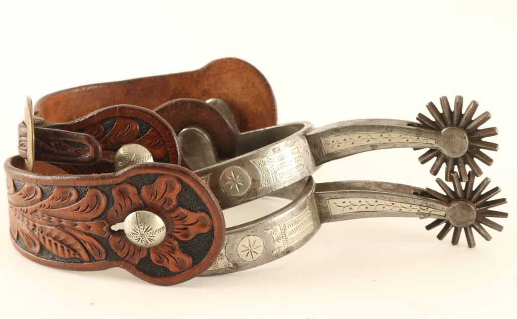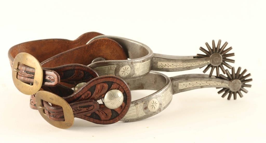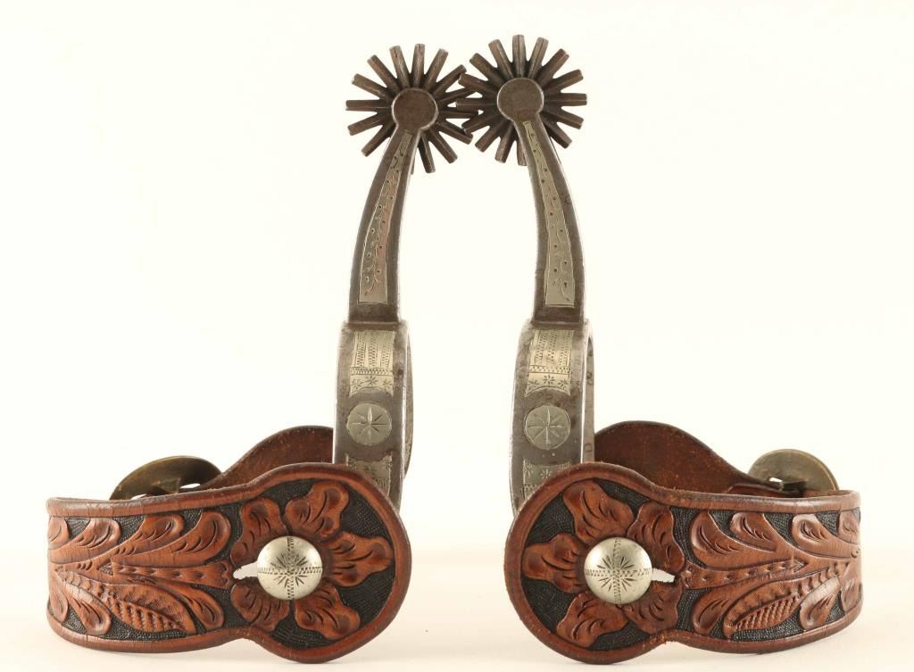 Double mounted engraved silver overlaid design with a shield motif with beautiful floral tooled spur straps. Circa 1910-1920.