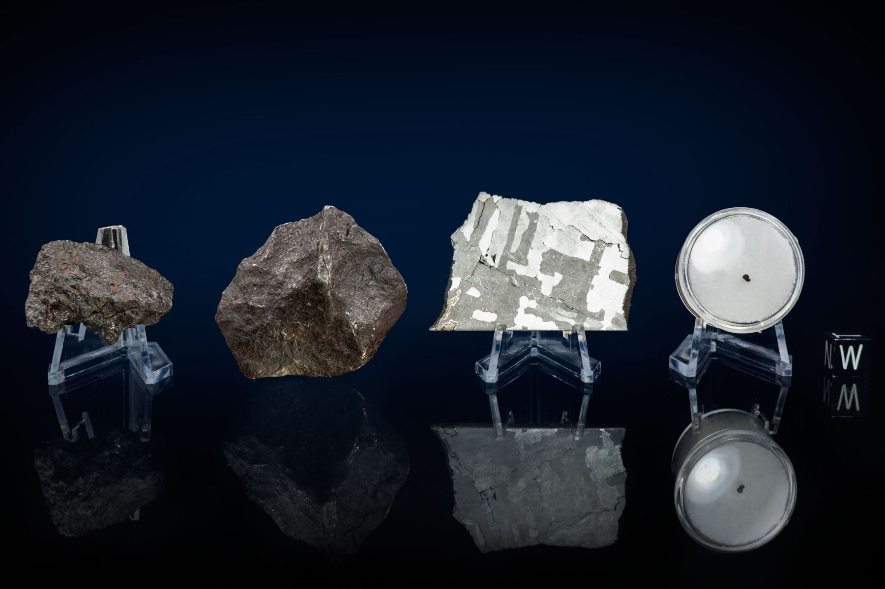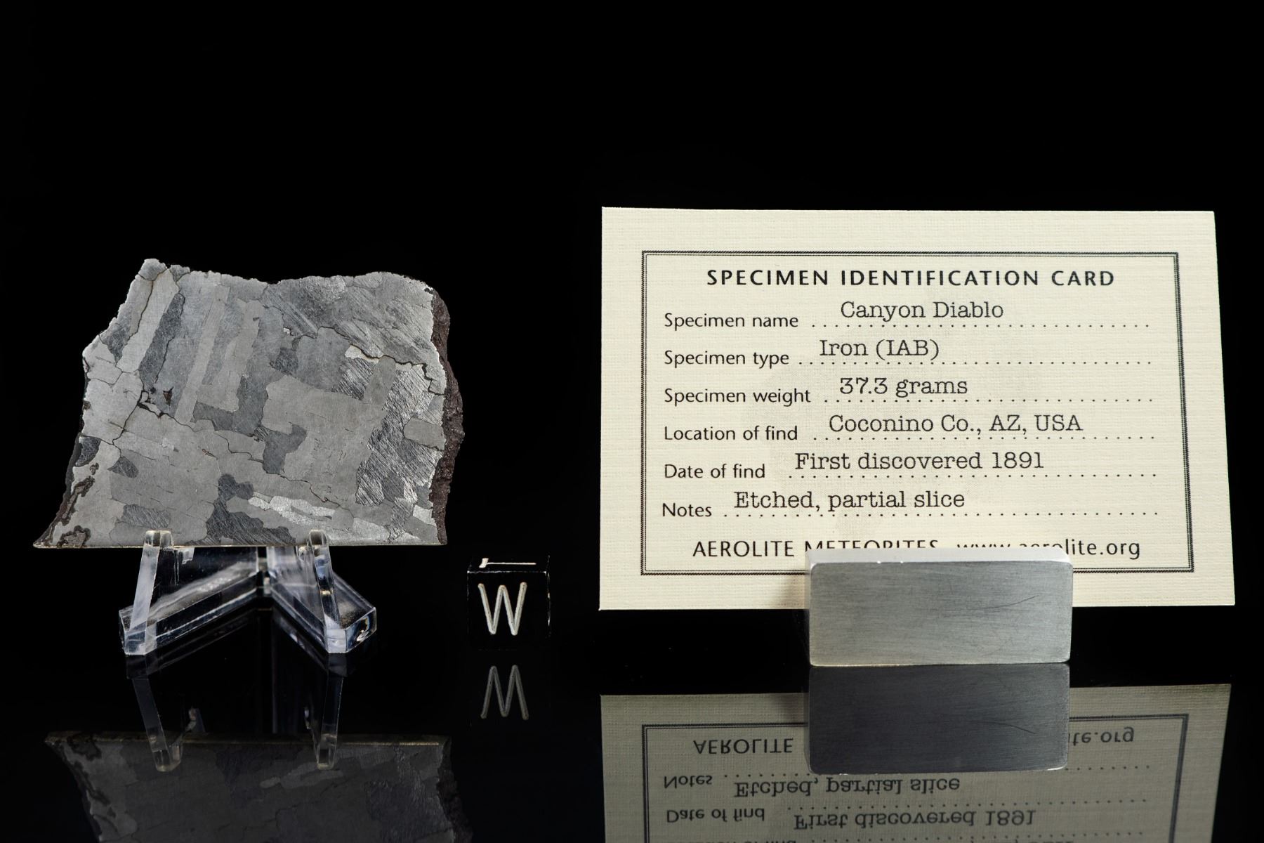 Meteor Crater in Arizona is the most recognizable and best-known meteorite feature on Earth and is visited by many thousands of tourists annually. Estimates of its age vary from 25,000 to 50,000 years, but all parties concur that it is the finest and best-preserved large meteorite crater on our planet. It was the first proven meteorite crater and seminal meteoriticist H. H. Nininger conducted years of research at the site and also opened the world’s first private meteorite museum close by. Meteor Crater was studied by legendary geologist Gene Shoemaker and some of NASA’s Apollo astronauts were trained there. Canyon Diablo is a steep-sided ravine some distance west of the crater and meteorites found around the crater take their name from it (the convention being that meteorites are named after the nearest town or geographical feature to their fall location). Meteor Crater is internationally recognized as a scientific site of unique importance and meteorite collecting there is no longer permitted. Older specimens that were found during the first half of the 19th century, when meteorite hunting was still allowed there, are therefore highly desirable. This fascinating lot includes four items: