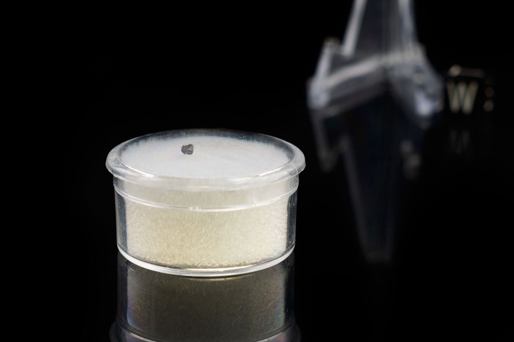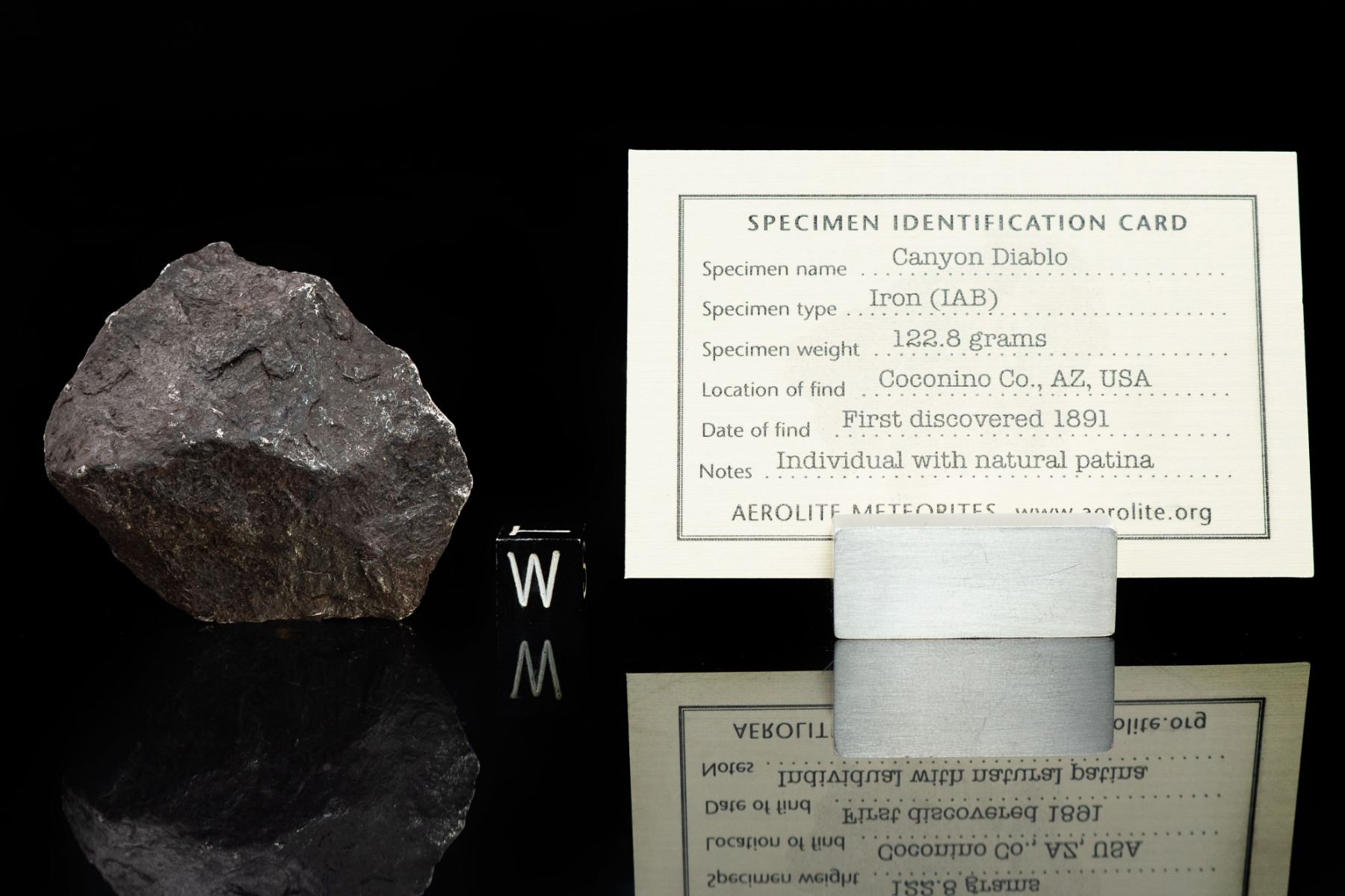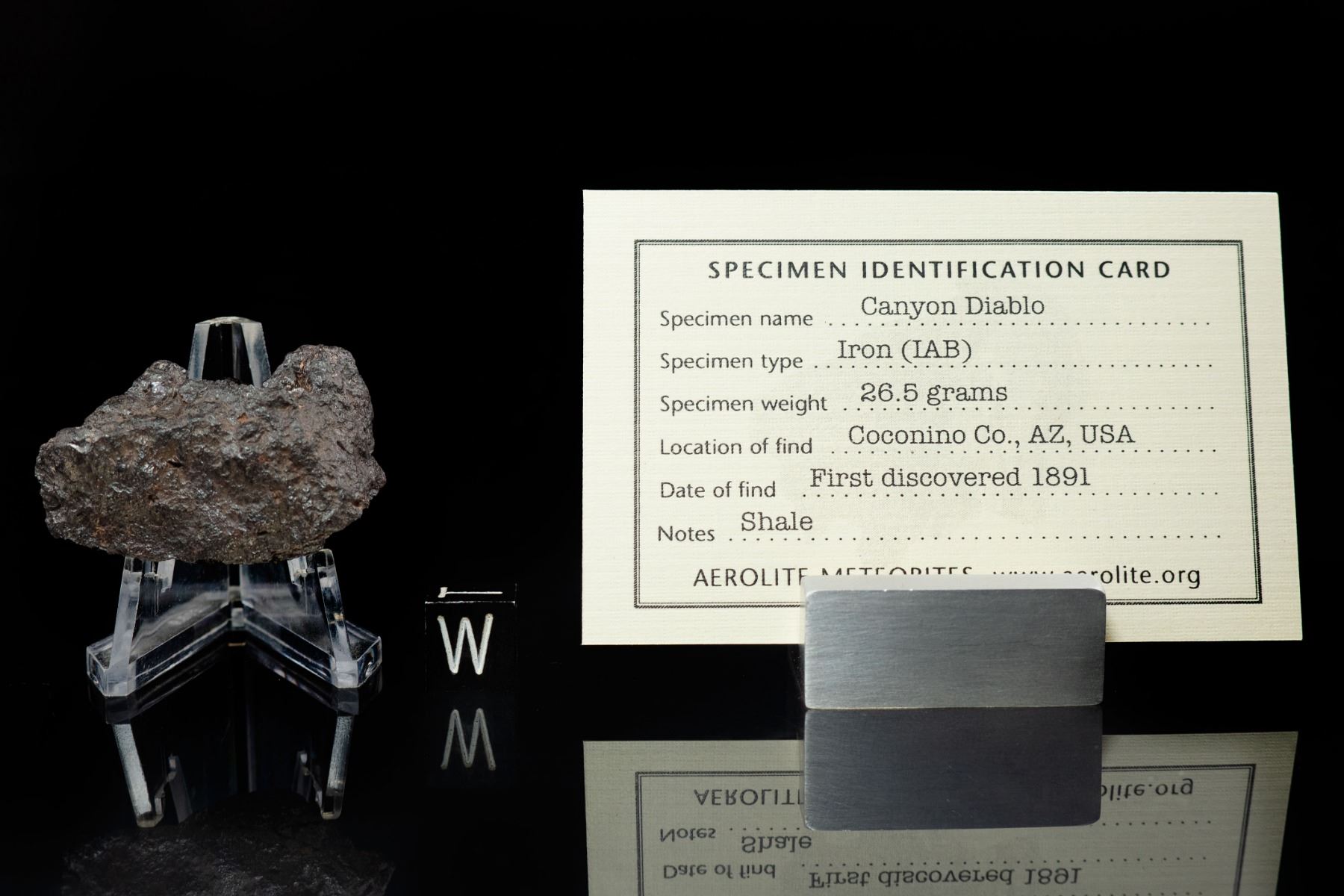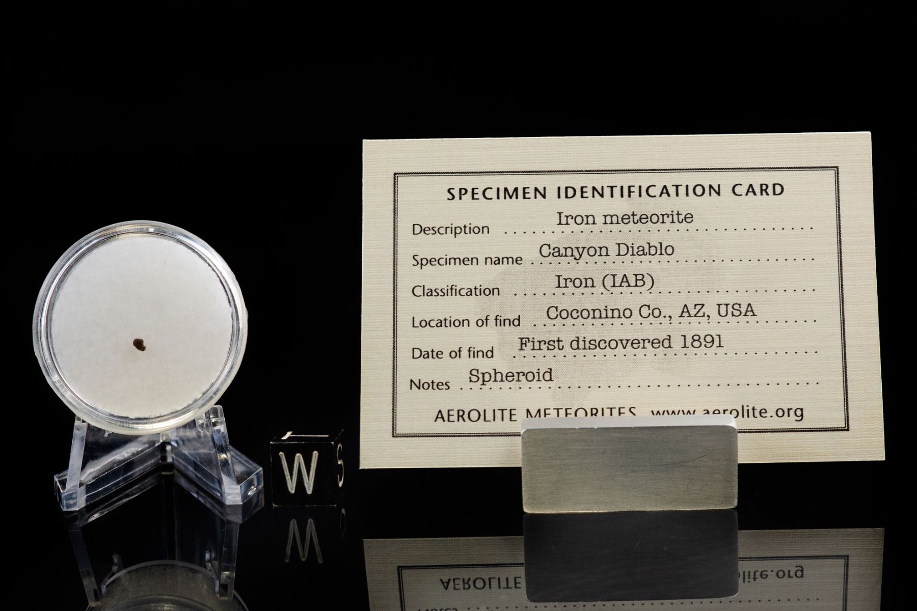 4. An extremely rare Caynon Diablo spherule, likely collected by H. H. Nininger and his team. Dr. Nininger's groundbreaking work at Meteor Crater suggested that much part of the crater-forming mass vaporized on impact and the condensed into tiny iron spheres, like this one, that fell around the crater and which were meticulously collected and studied to determine their meteoric origin. Accompanied by a certificate of authenticity signed by Geoff Notkin of Aerolite Meteorites Inc. and the TV show Meteorite Men, as well as a specimen identification cards.