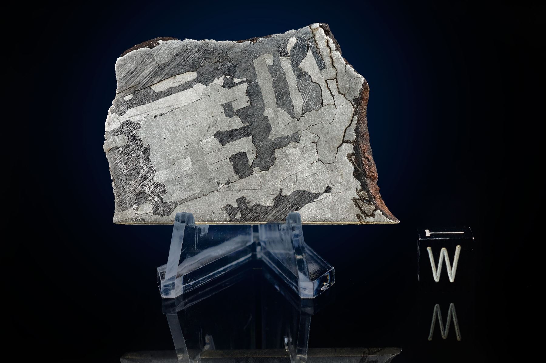 3. A partial slice of the Canyon Diablo meteorite showing its signature Widmanstätten pattern. This meteorite is rarely seen in slices as whole irons sometimes contain micro diamonds which wreak havoc on blades. As such, the few labs that are capable of preparing iron meteorites in this manner are often reluctant to try slicing Canyon Diablo.