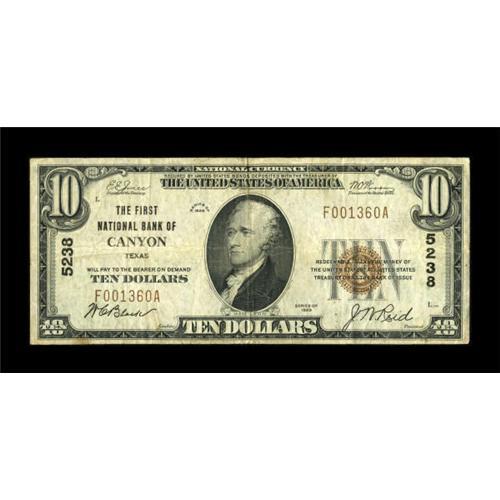 <B>Canyon, TX</B></I> - $10 1929 Ty. 1 <B>The First NB</B></I> Ch. # 5238<BR> A scarcer west Texas bank with fewer than a dozen Series 1929 examples reported from here to date. <B>Fine.</B></I> <BR><BR><b>Shipping:</b> Coins & Currency (<a target="_blank" href="http://www.heritageauctions.com/common/shipping.php">view shipping information</a>)