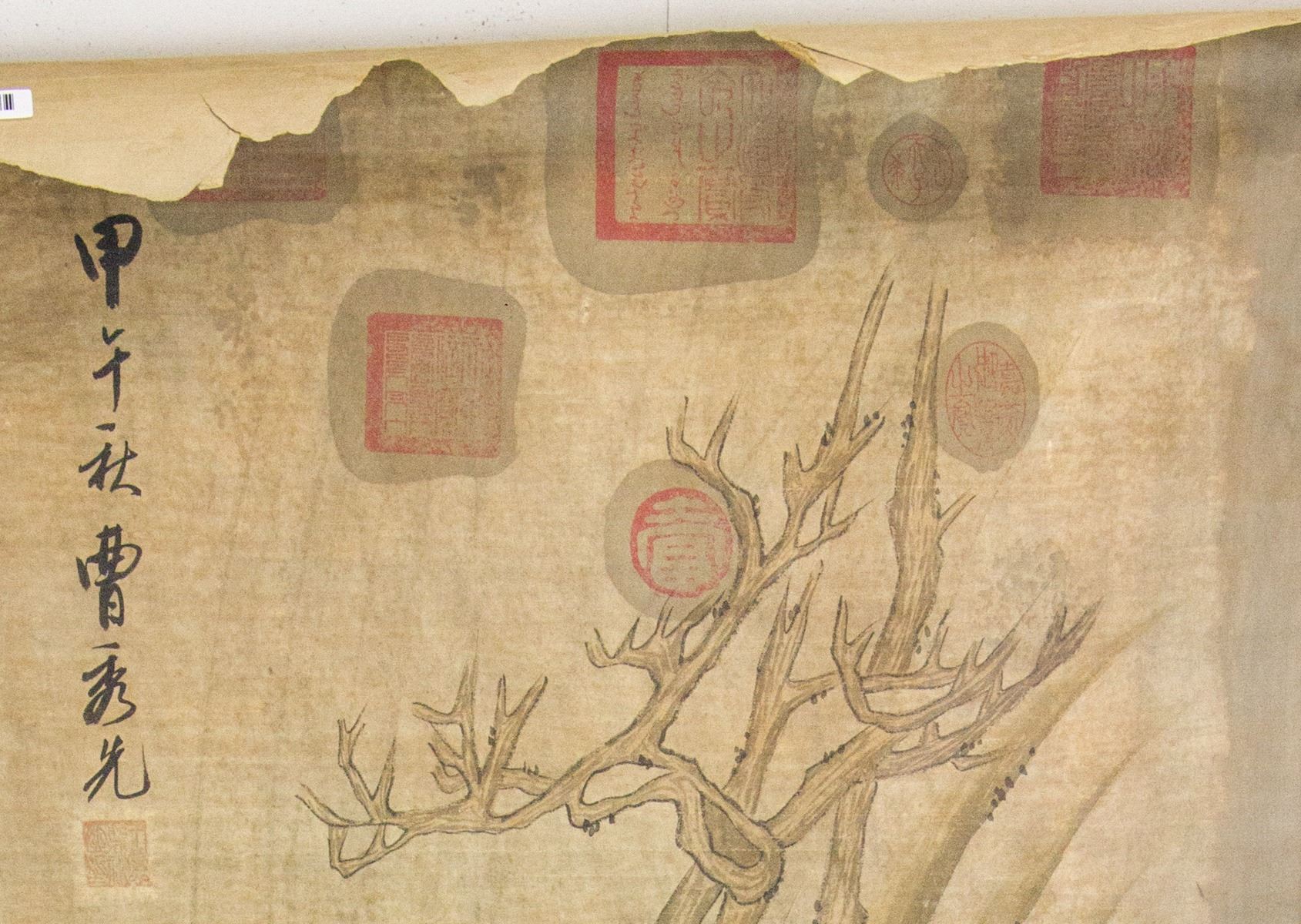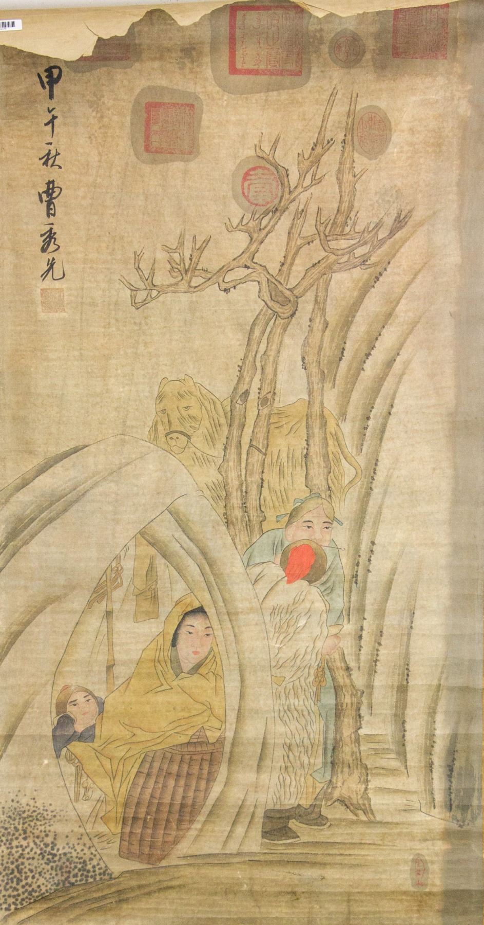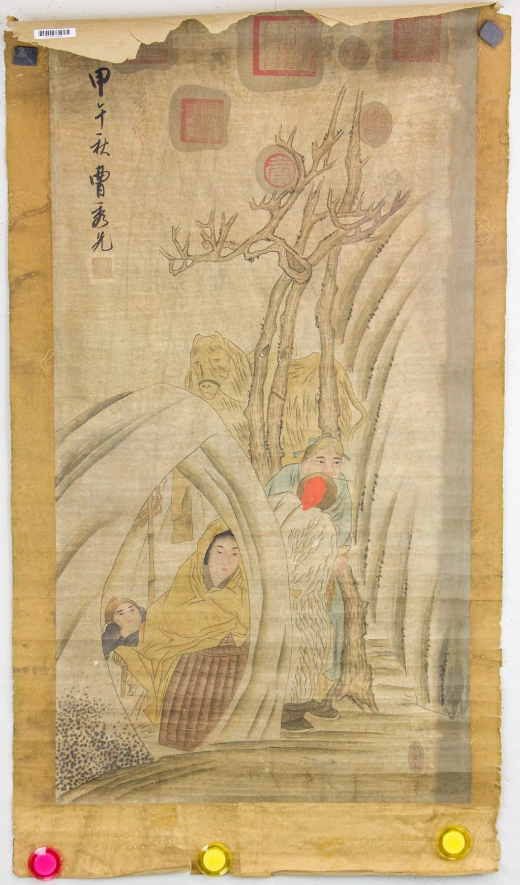 Ink and watercolor on paper roll. Featuring painting of camping scene. Signed Cao Xiuxian 1708-1784 Chinese, inscribed with 1 artist seal, with 5 imperial collection seals. 91 x 45 cm