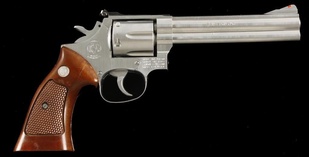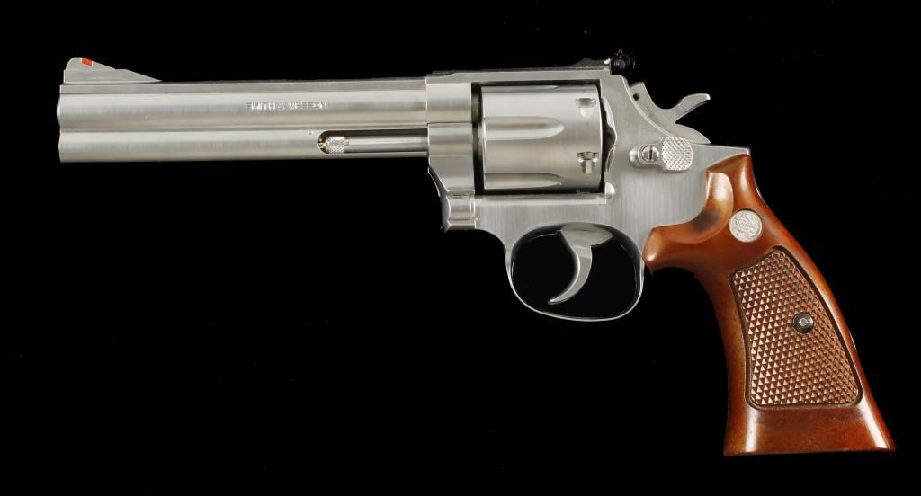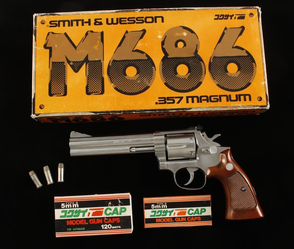 By Kokusai. Model of the 686 Smith & Wesson .357 Magnum. Includes (120) Type-B 5mm Model Gun Caps, original box, and manual. Action needs repaired.