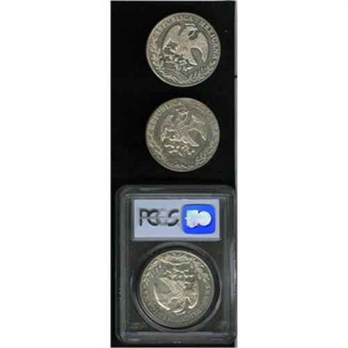 <B>Cap and Ray 8 Reales as follows:</B></I> 1858 Mo-FH, prooflike BU with light scuffing; 1887 Mo-MH, BU with light hairlines; and an 1888 Zs-FZ, MS63 PCGS. <B>A sold as is, no return lot.</B></I> <B>A sold as is, no return lot.</B></I>