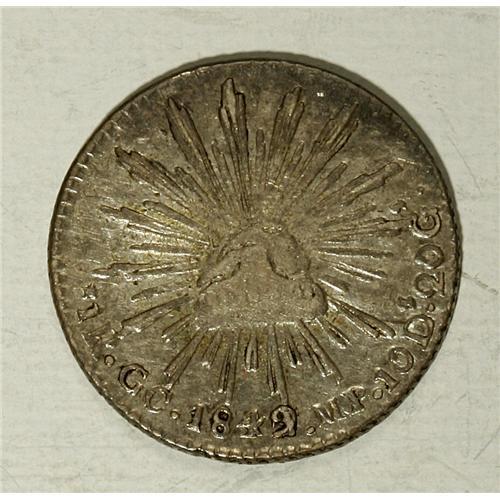 <B>Cap and Rays silver Real 1849/8-GC MP blundered date,</B></I> KM-372.5, lovely original XF-AU with silvery gray toning and a better than normal strike (cf the Krause plate pieces). From a famous old collection.<BR><I>From the Louis E. Eliasberg, Sr. Collection</B></I><BR><BR><b>Shipping:</b> Coin/Currency (<a target="_blank" href="http://www.heritageauctions.com/common/shipping.php">view shipping information</a>)