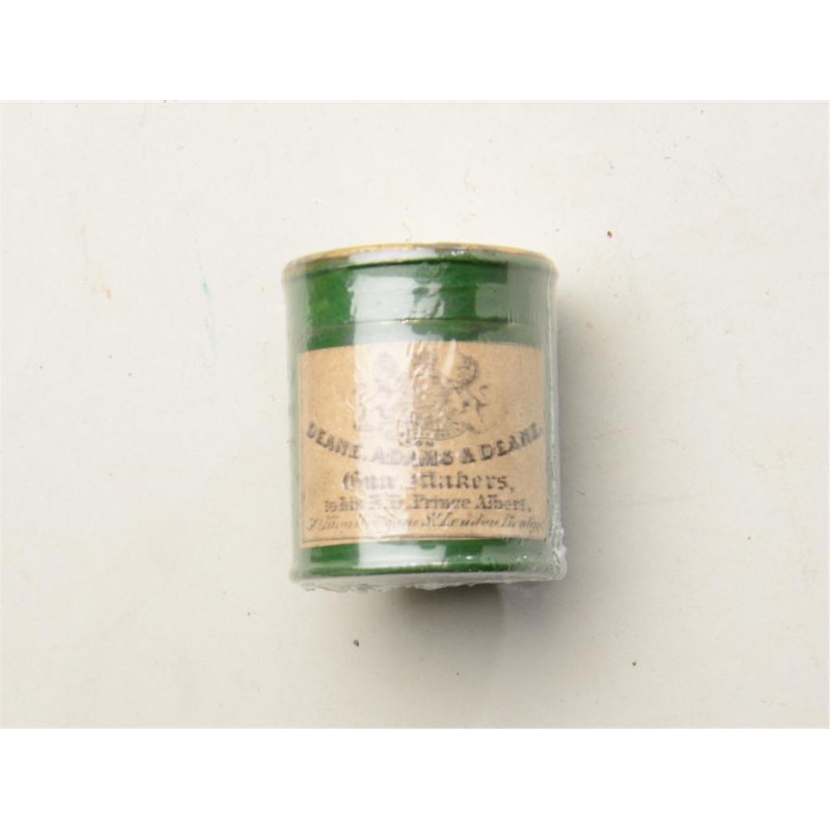 Cap tin of large size, Eley caps with label “Dean Adams & Dean”, revolver era. 1-7/8” in height. Showing gold label, green body, nearly full, very good plus to near fine condition. Est: $75 - $150