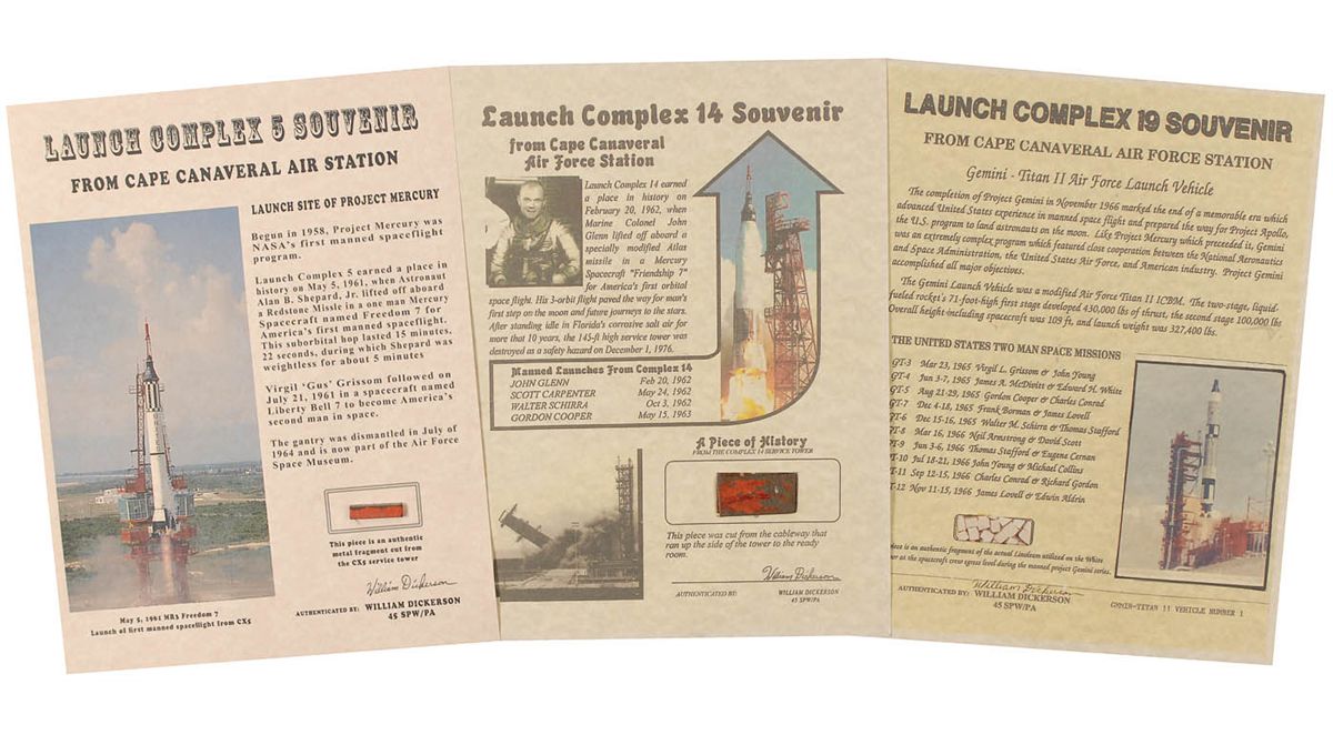 Three small relics taken from different launch complexes at Cape Canaveral. Relics are: metal from the CX5 service tower of Complex 5; cableway from the Complex 14 tower to the Ready Room; and linoleum from the White Room of Complex 19. All three are affixed to a printed 8.5 x 11 informational sheet, authenticated by William Dickerson.