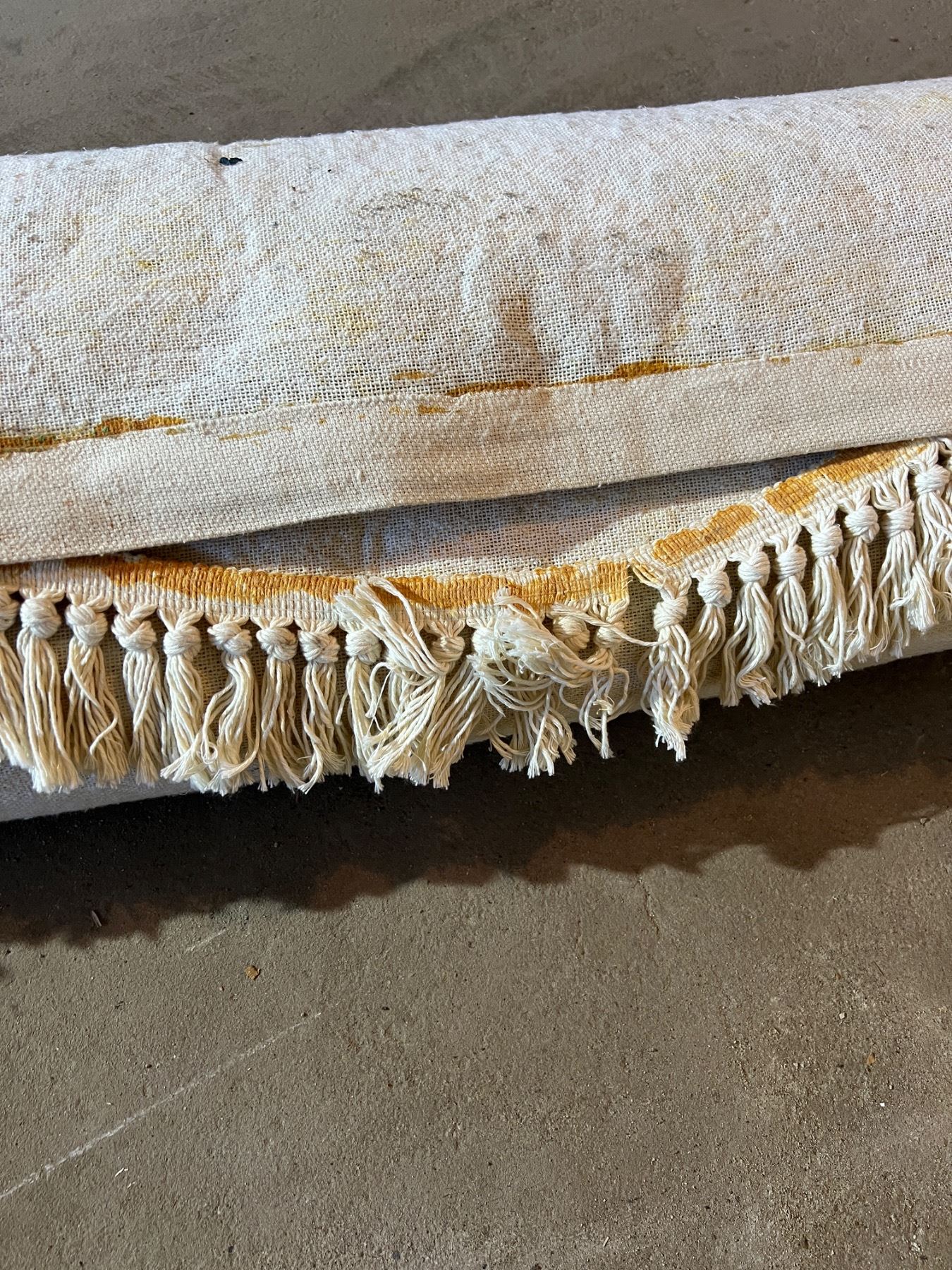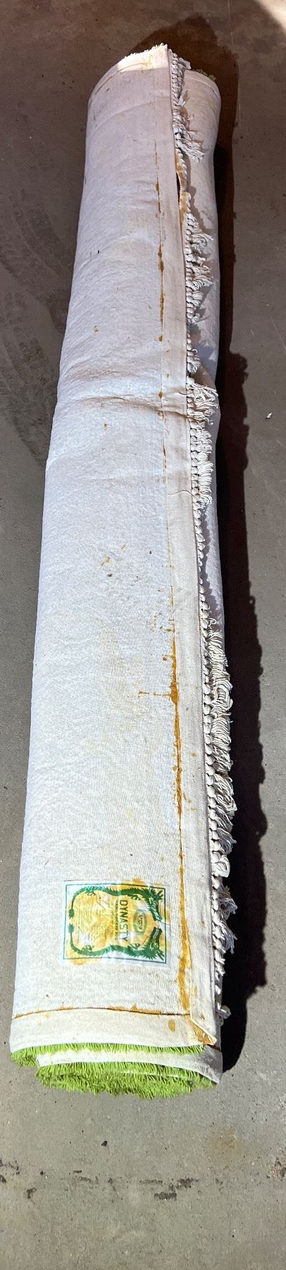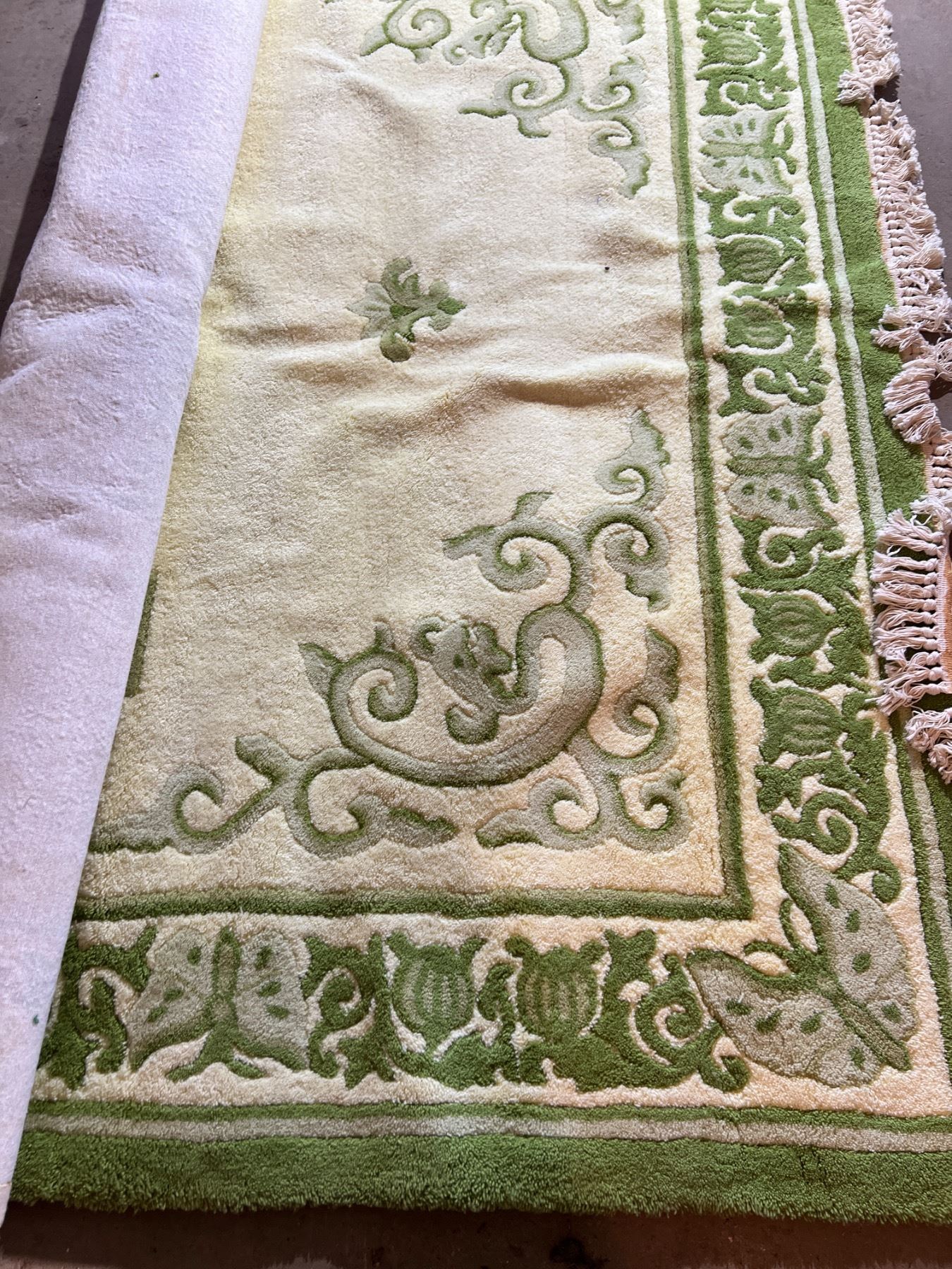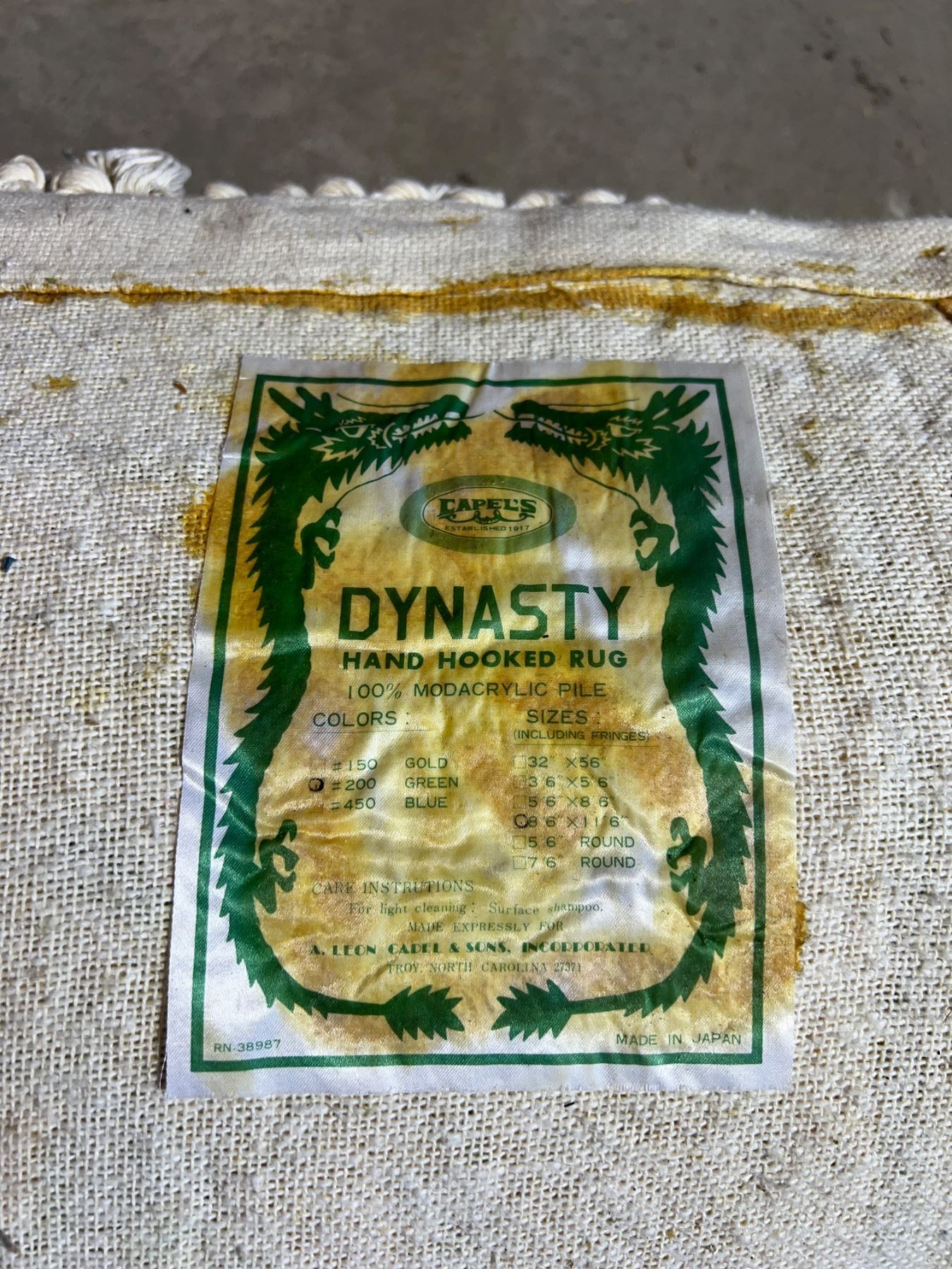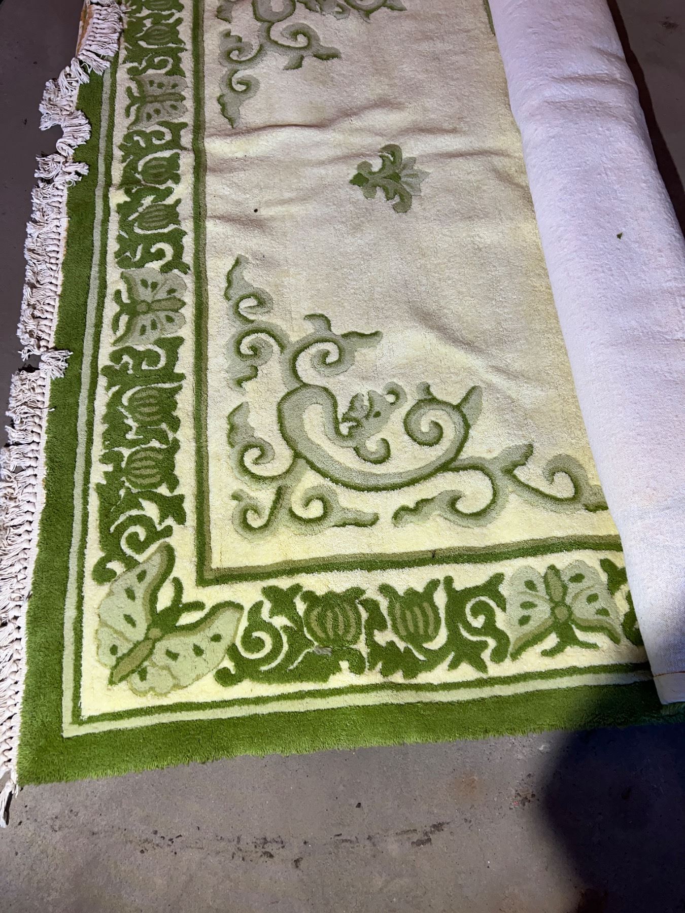 8' 6" by 11' 6". Has stains near tag. Some separation.