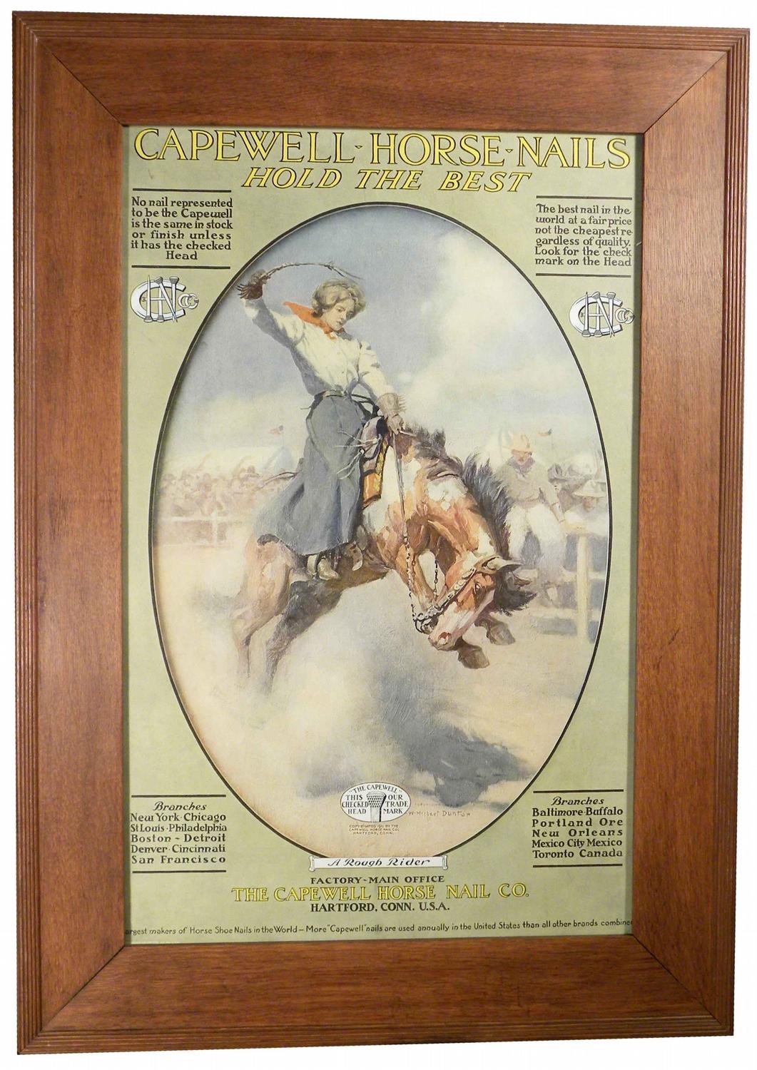 Capewell Horse Nails Paper Sign. The Capewell Horse Nail Co. Hartford, CT. Entitled, "A Rough Rider". Illustration of Cowgirl on bucking bronc by W.H. "Buck" Dunton, 1911. Framed under glass. 16 1/2 X 25 1/2 inches image only.