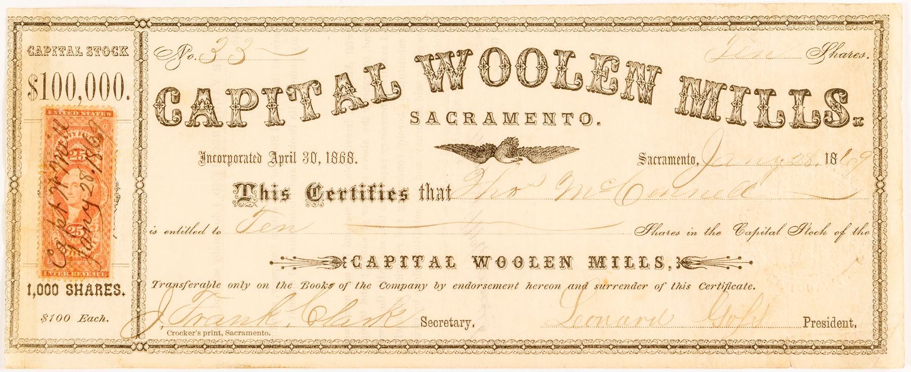 I/U to Tho. McCornell in 1869. #33 for 10 shares, signed by president Leonard Goss and secretary J. Frank Clark. 4" x 10". According to a July 1869 Sacramento Daily Union article, the corporate office was located at the corner of C & 16th Streets and the company "Manufactures All Kinds of Fancy Cassimeres, Flannels, and Superior Blankets of Every Description." Agents were C.A. Peake & Co. and R.T. Brown & Co. Date: Location: Sacramento, California HWAC # 54365