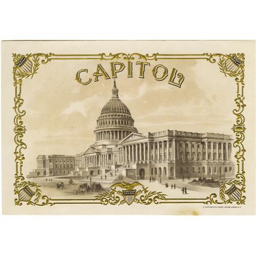 <B><I>Capitol</B></I></B></I><B> Architectural Cigar Label by F. Heppenheimer's Sons Litho. of New York.</B></I> A brown and black duotone 7" x 4.75" inner label is accented with a gold-embossed brand name and a decorative border which is anchored by American flag shields. The United States Capitol Building, shown here in a 3/4 view, forms the backdrop for a stately promenade of carriages and Edwardian pedestrians. A minute stain is on the lower margin, else excellent condition.<BR><BR><b>Shipping:</b> Small Flat (<a target="_blank" href="http://www.heritageauctions.com/common/shipping.php">view shipping information</a>)