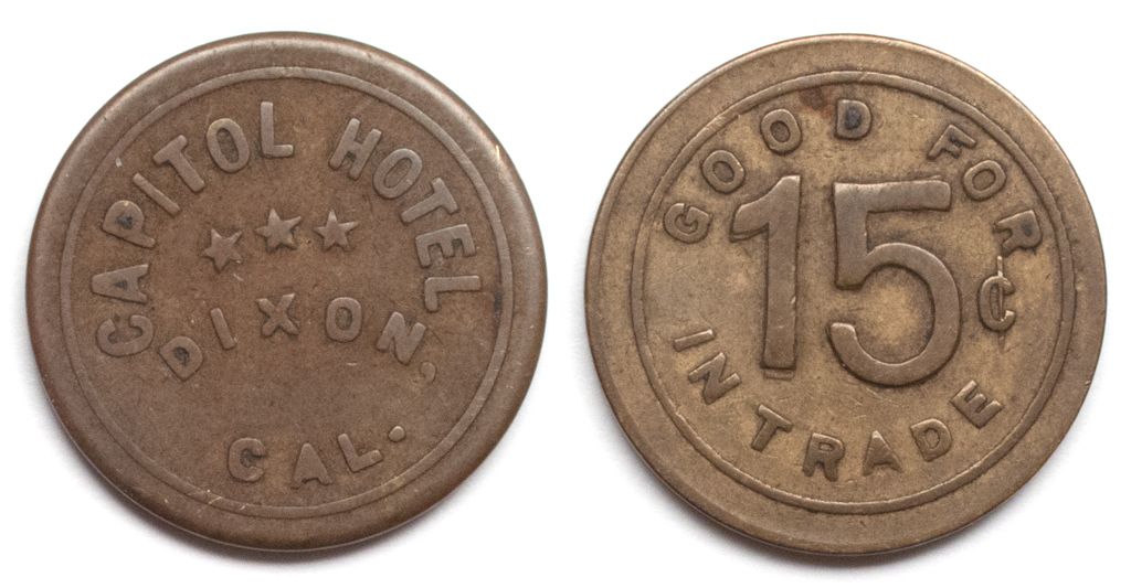 Obv.: Capitol Hotel / Dixon / Cal.; rev.: Good For / 15c / In Trade. Rd., 21mm.City: DixonCounty: SolanoState: CADate: