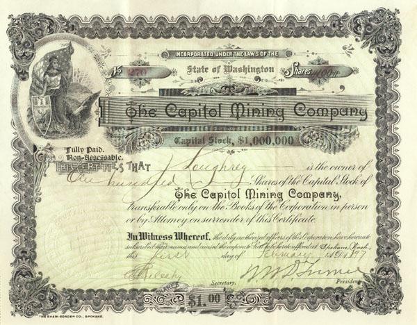 1897. Washington. Stock certificate for 100 shares. Black with light green background. Vignette of allegorical figure at top left. Uncancelled. Very fine.