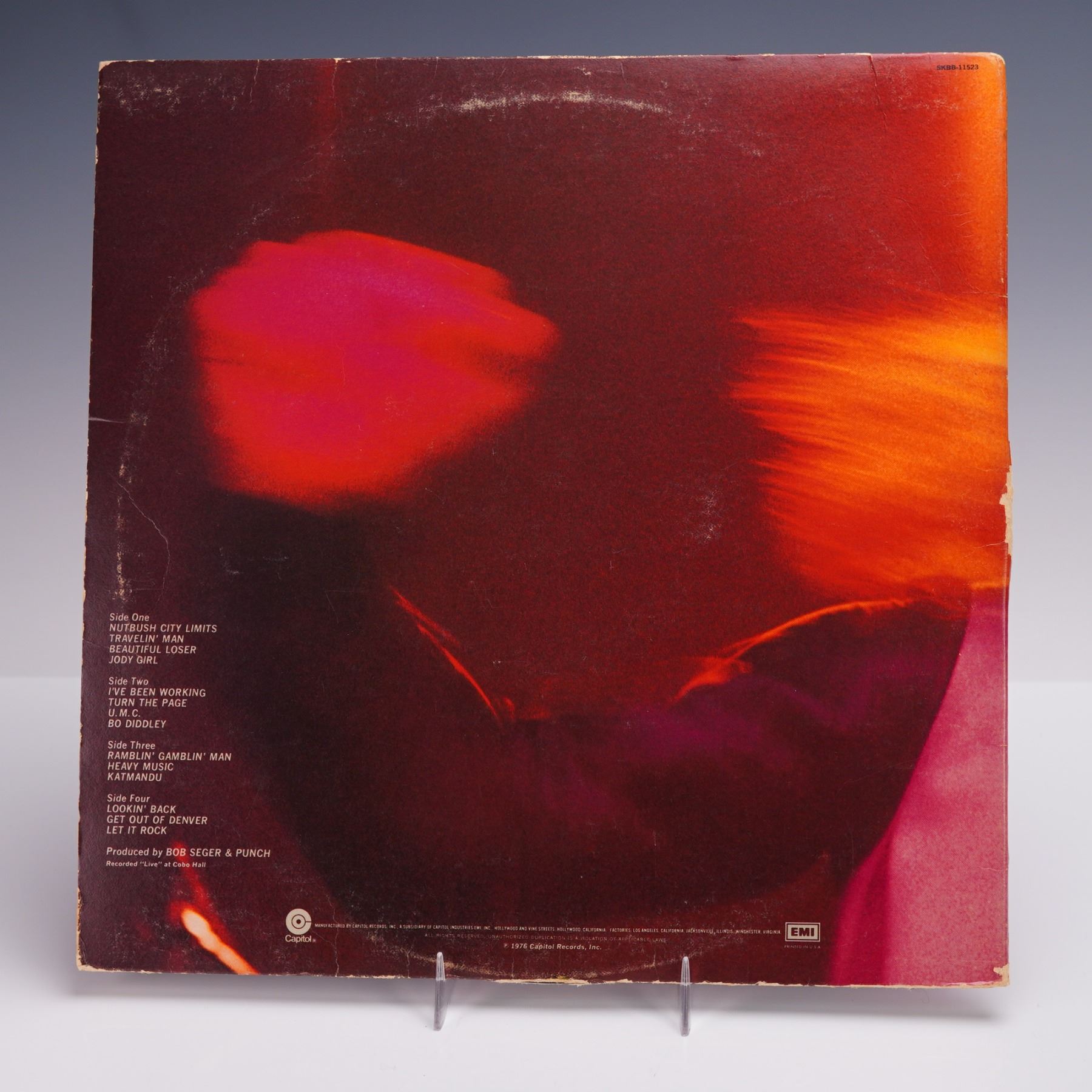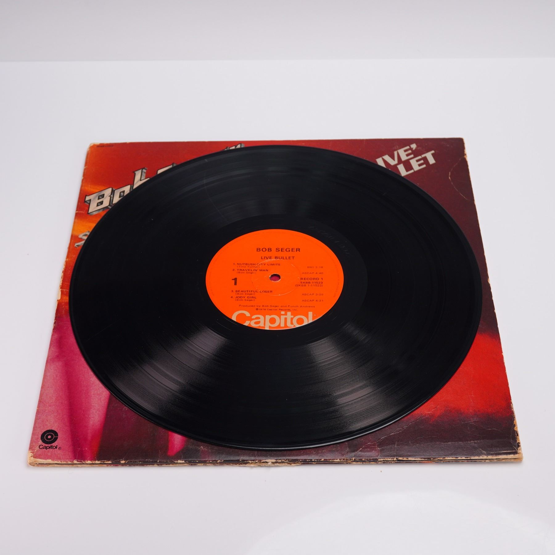 Original 1976 pressing of "Live Bullet" by Bob Seger & The Silver Bullet Band, issued as a double LP on Capitol Records. This live album captures performances recorded at Detroit's Cobo Hall in September 1975, showcasing a powerful setlist that includes "Nutbush City Limits," "Travelin' Man," "Turn the Page," and "Katmandu." The vibrant red-toned gatefold cover features high energy concert imagery and printed track listings on the reverse. The records display the signature Capitol orange labels.