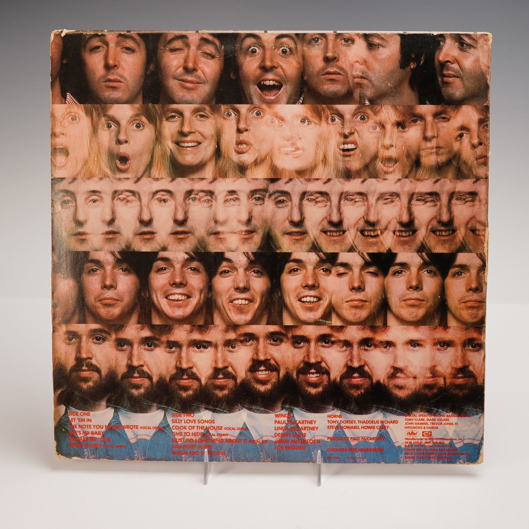 A 12-inch vinyl LP of "At the Speed of Sound" by Wings, released in 1976 on Capitol Records. This pressing features ten tracks including "Let 'Em In," "Silly Love Songs," "Beware My Love," and "Warm and Beautiful." The album was produced by Paul McCartney and engineered by Peter Henderson, with performances by the full Wings lineup, giving vocal and instrumental spotlight to each band member. The cover design presents a striking grid background with bold, gradient red and orange block lettering, while the reverse sleeve features a sequence of stylized, repeated facial expressions from each band member in a colorful photomontage.