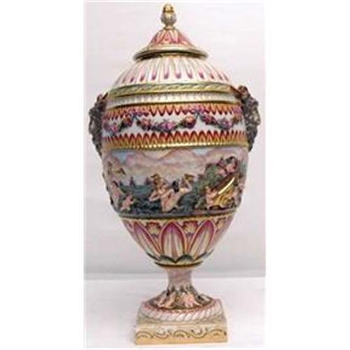 Capo Di Monte covered urn with rams head and colorful figural design overall. Mark on the bottom. 20"T, 11"W, 5 1/2" square base. Total weight 13 lbs. Very good condition. No chips, cracks or repairs.