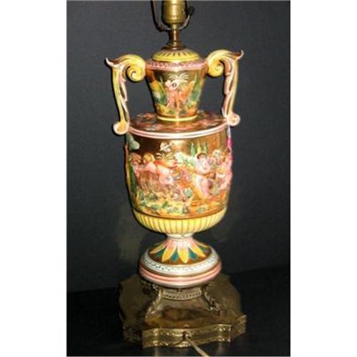 Is a Beautiful Capo Di Monte Urn transform as a Table Lamp.This lamp has a bronze feet support and has nice decoration with Cupids enjoying the Exotic Paradise and playing around Size:32" H X 10 " W