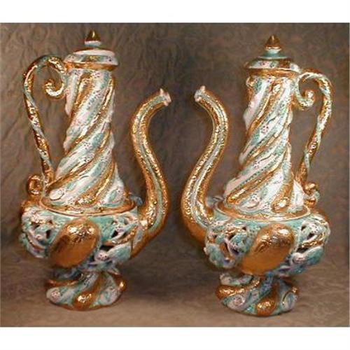 like giant coffee pots, they are a swirl of white, gold and teal.