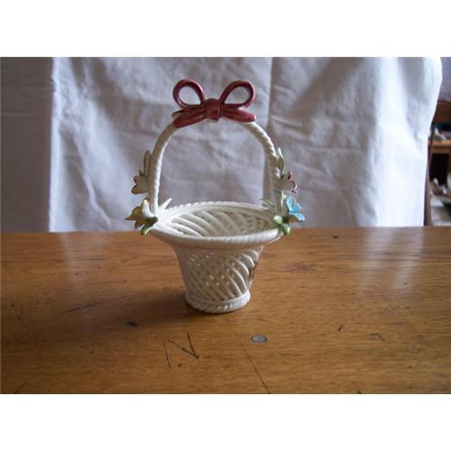 Darling capo-di-monte basket with bow and applied flowers.Perfect condition.Open weave basket and measures 5 1/2" tall.Has a paper label plus marked on base.