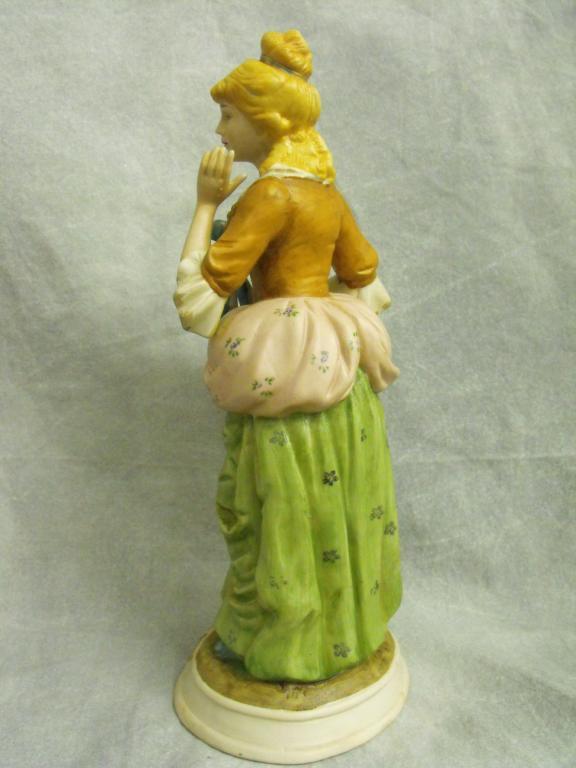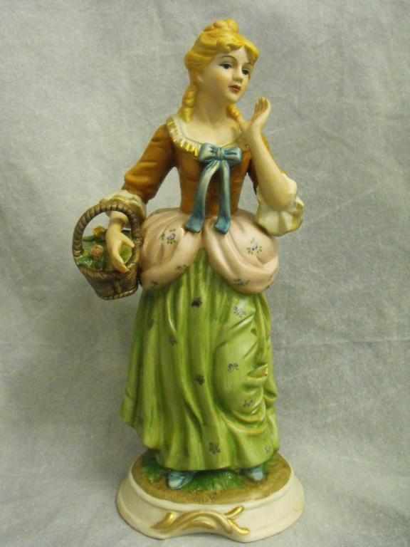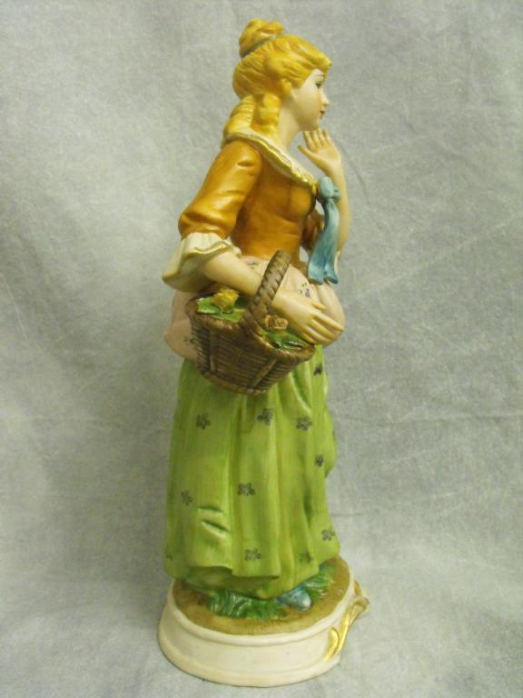 Classical 18th century provential young lady holding a basket of flowers standing on a naturalistic base 13" tall in near new condition.