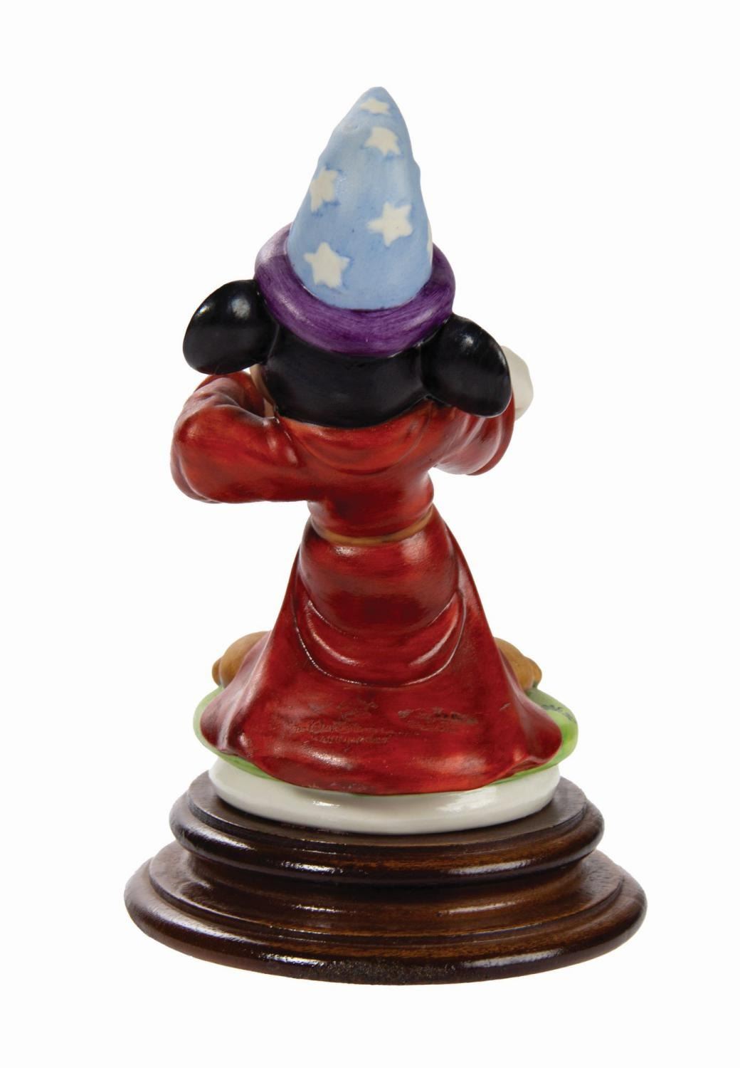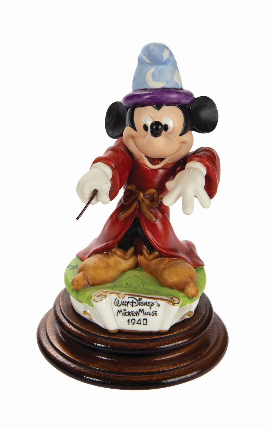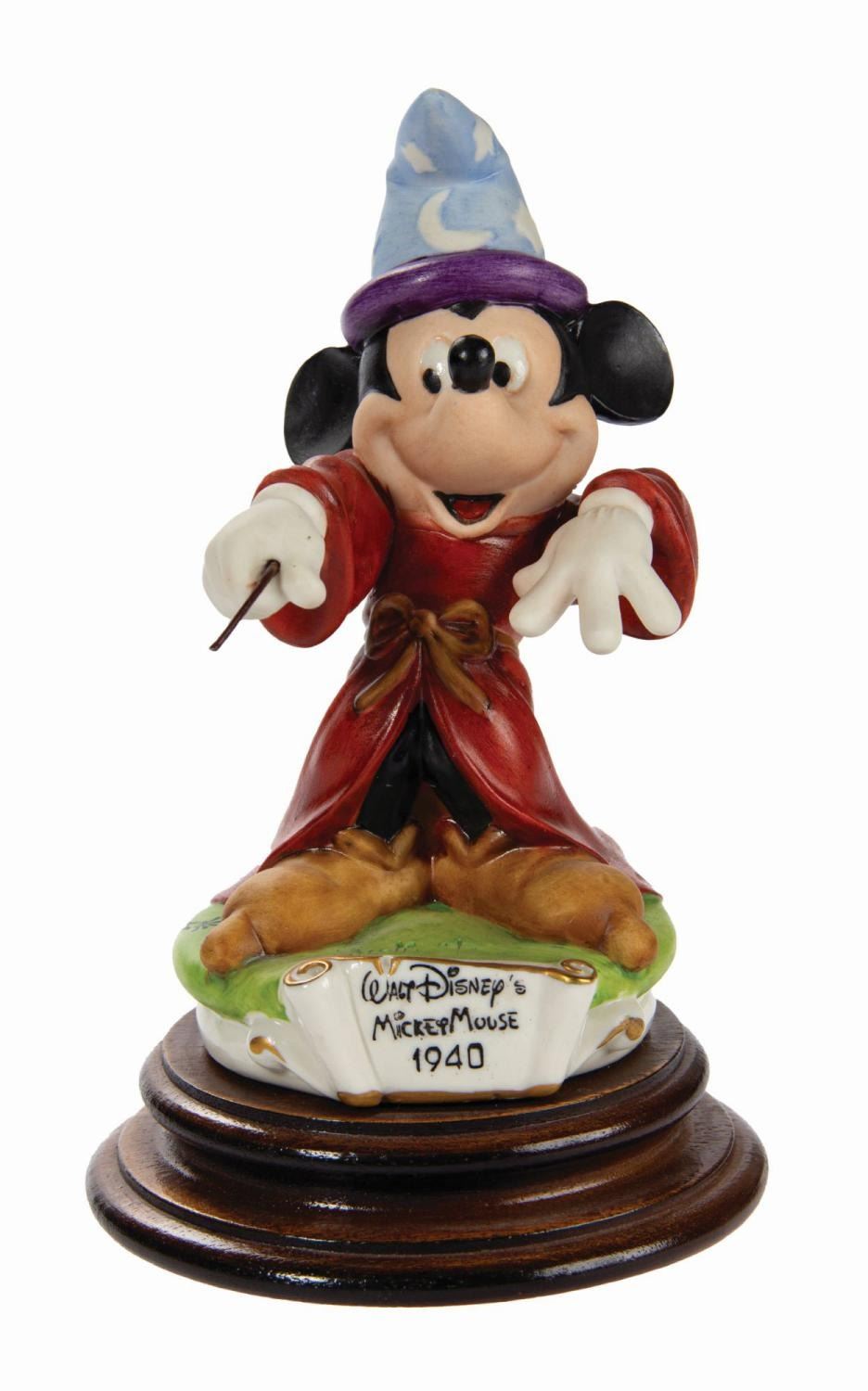 (Disney, c.1980s) A limited edition Walt Disney's Mickey Mouse 1940 figurine designed by renowned sculptor Enzo Arzenton for the Laurenz Collection. Crafted in fine Capodiamonte porcelain mounted to a wooden pedestal base, the piece retains its incised maker's stamps. Created in an edition of 5000, the bottom of the base is numbered in silver ink, "n2651." Measuring 8" tall and 5" diameter (including the base), the figure is in very good condition with some minor paint markings to Mickey's glove from the magic wand.