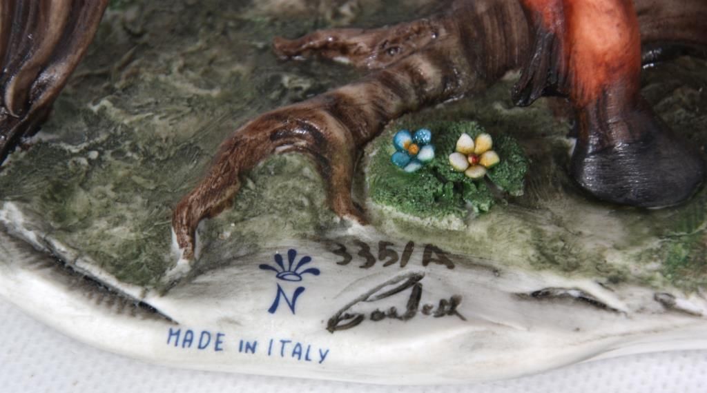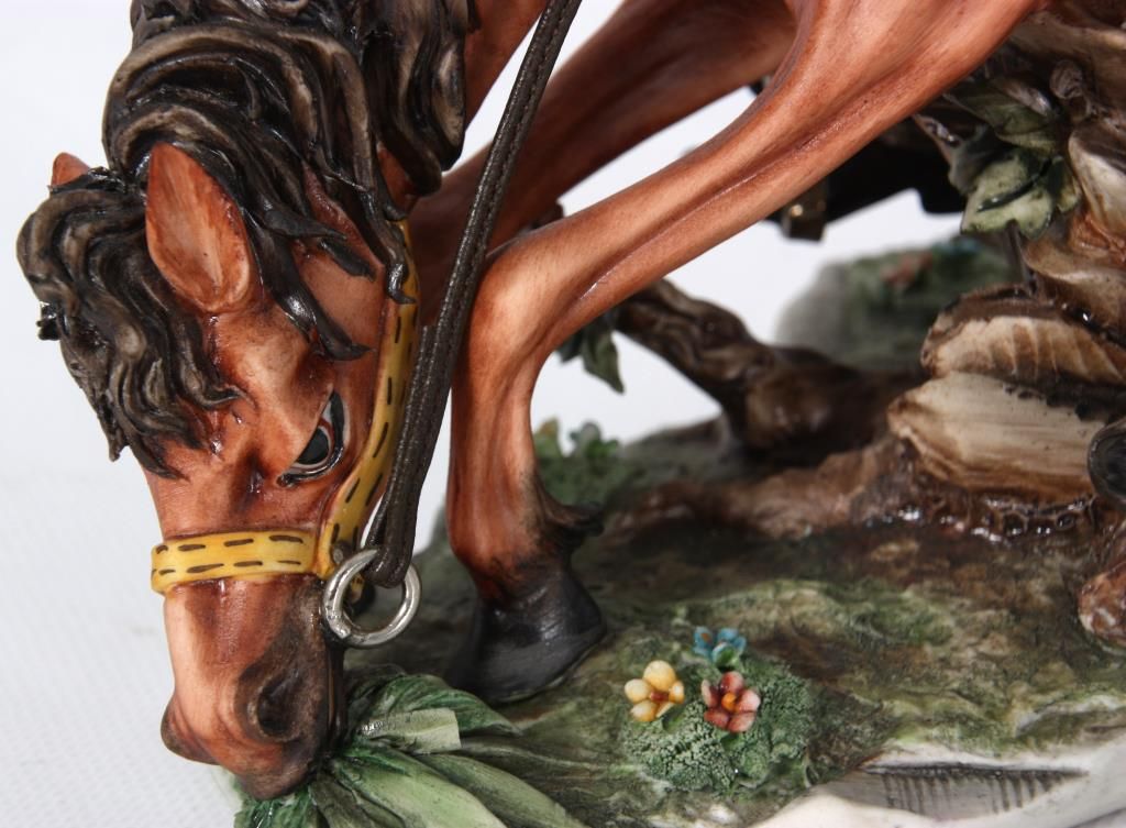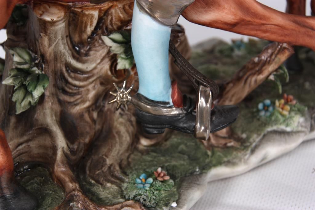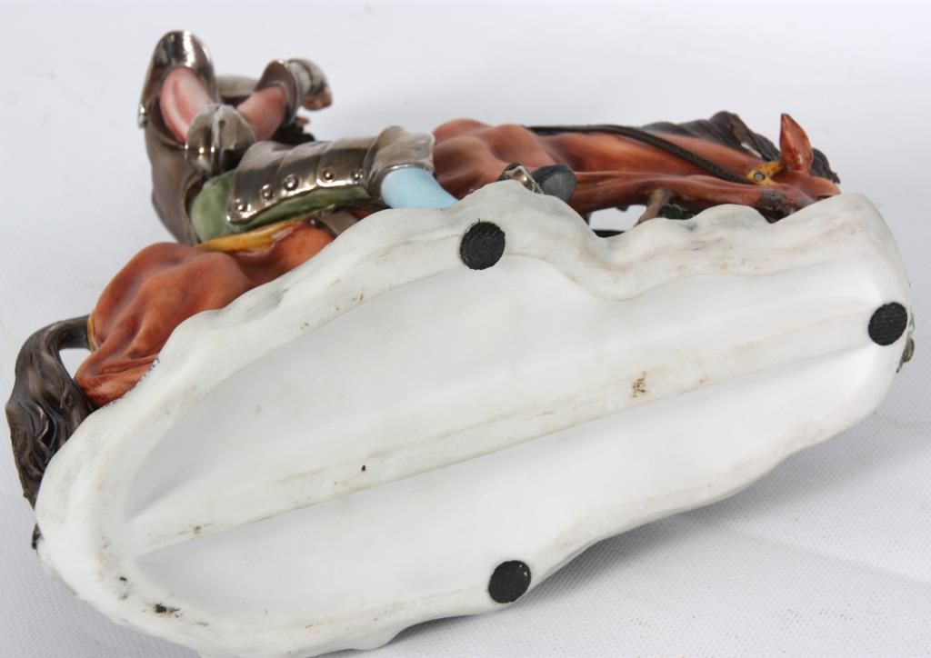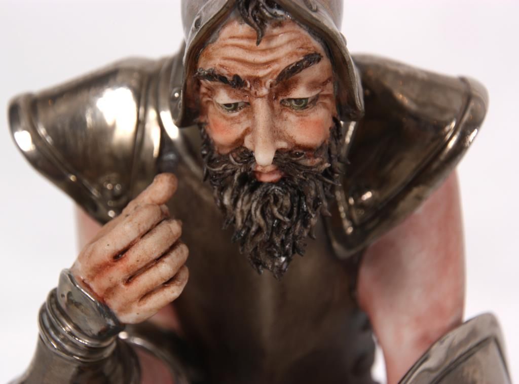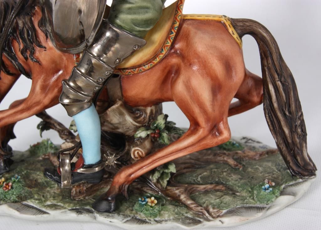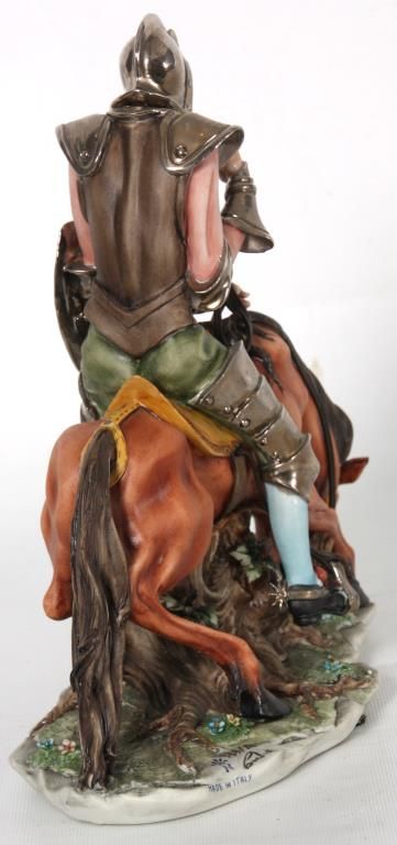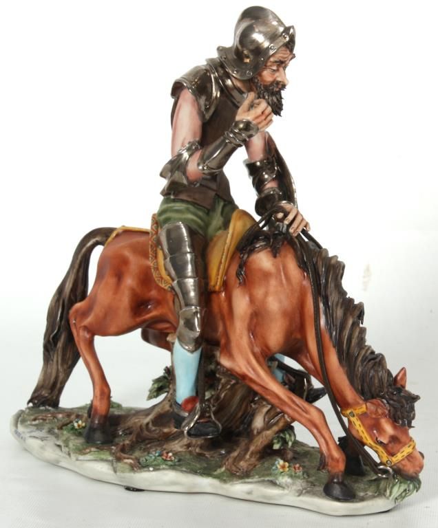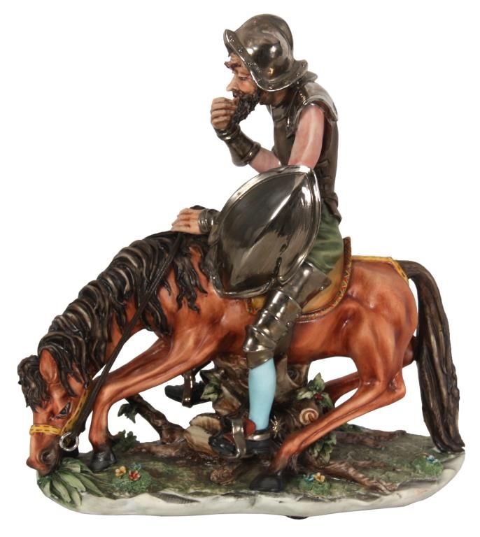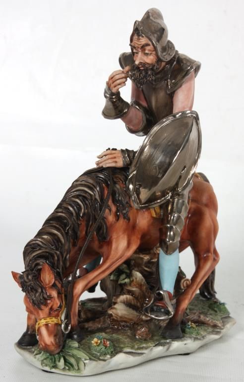 Capodimonte Don Quixote Figure. Don Quixote is seated on his horse wearing silvered armor, stirrups, spurs and a shield; the horse and the figures clothing have a soft, brushed finish and the horse is grazing on the grass as it walks. Signed with Capodimonte - crown over N mark, numbered 335-A and artist signed Godesh. In good condition with no breaks or repairs, figure is missing his spear which is unattached. 10.75 in. high x 10.5 in. wide x 5 in. deep.