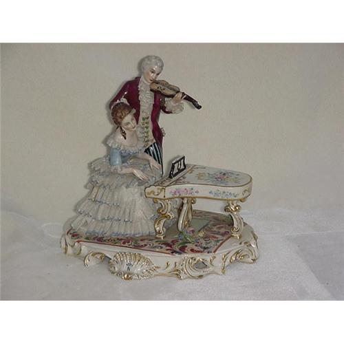 A hand painted porcelian figural group, 10'' tall, 10'' long. A man and woman, the woman seated playing the piano, the man standing playing a violin. Damage to the lace as shown, Bow to violin missing and thumb on woman's right hand missing. Crown mark on front of figure. Made in Italy on underside. Sold as is.
