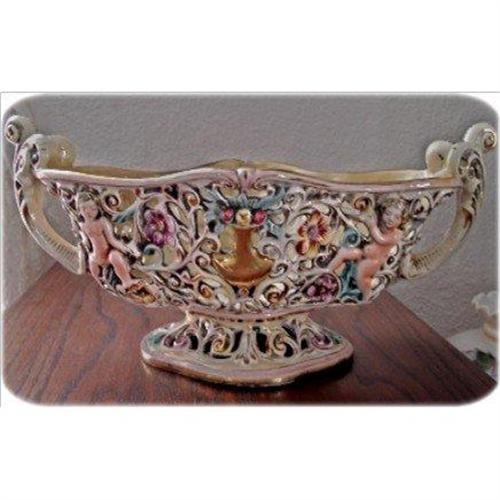 Grand in size Capo di Monte centerpiece bowl fired gold accents with a raised motif of flower heads and Putti or Cherub figures in high relief with extensive overall pierce work in scroll and loop pattern. Heavy gold fired urn medallions front and back, gilt tracery in the interior bottom of bowl and gilt detailing on ornate handles and scalloped pedestal base and foot.<p>Piece is in exceptional condition with quality detail in the design. Bowl measures 14.75 inches long with a height of 6.75 inches. Width front to back measures 7.25 inches. Blue inkstamp mark on bottom of base. Estate piece of remarkable Italian craftsmanship.<p>