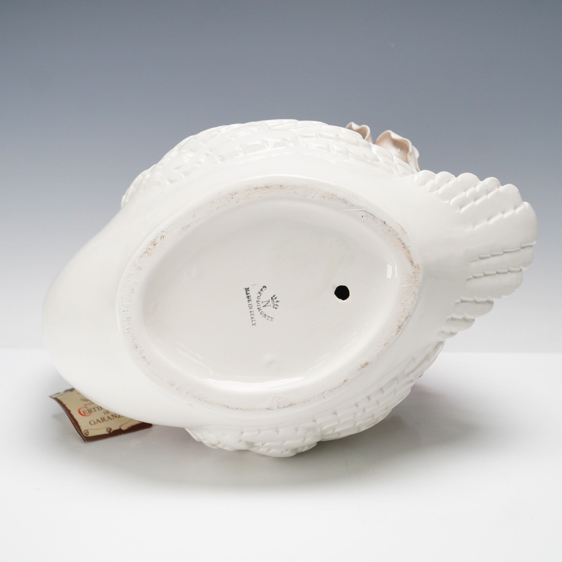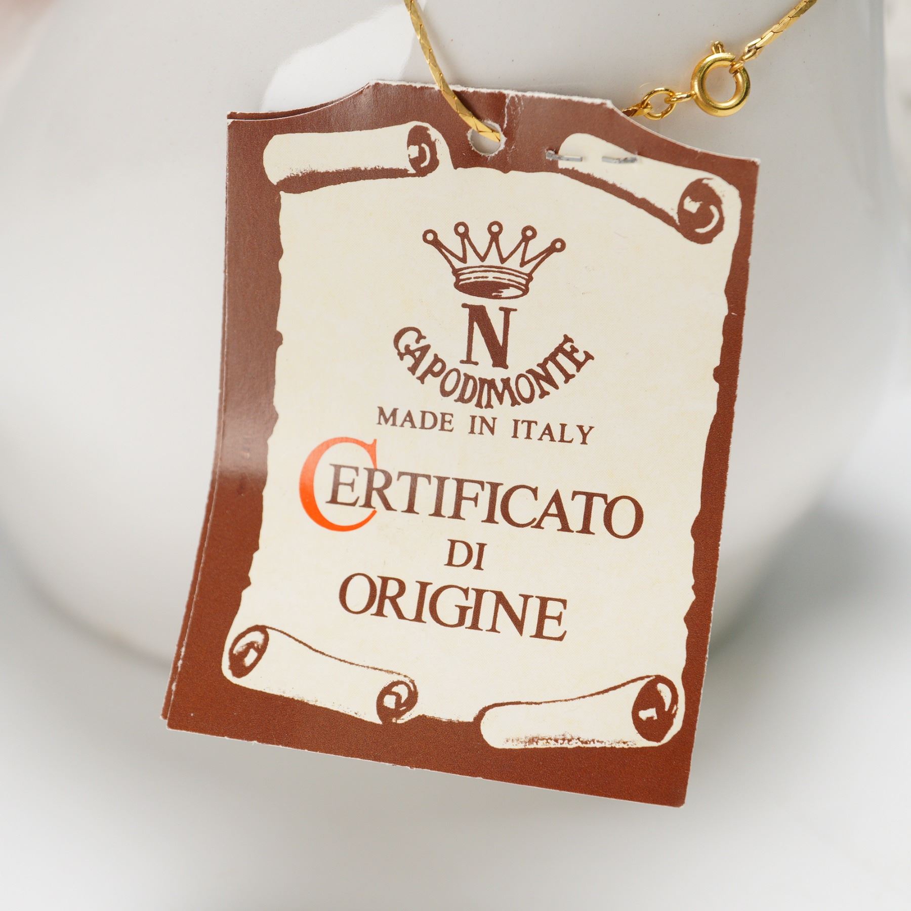 An exquisite Capodimonte porcelain swan sculpture, handcrafted in Italy and adorned with a vivid bouquet of hand-formed flowers. This large, elegant piece showcases Capodimonte's celebrated artistry and attention to detail, featuring a gracefully curved swan with finely modeled feathers, a warm ivory glaze accented with soft blush tones, and a cluster of delicate roses and leaves in shades of pink, yellow, and white. The naturalistic floral arrangement rests upon the swan's back, each petal and leaf individually sculpted and painted by hand, demonstrating the signature craftsmanship that defines authentic Capodimonte porcelain. The piece bears the traditional crowned "N" Capodimonte hallmark stamped on the underside and retains its original Certificato di Origine tag, confirming its Italian origin and authenticity. This decorative masterpiece embodies timeless European elegance and would make a striking centerpiece or collector's display.