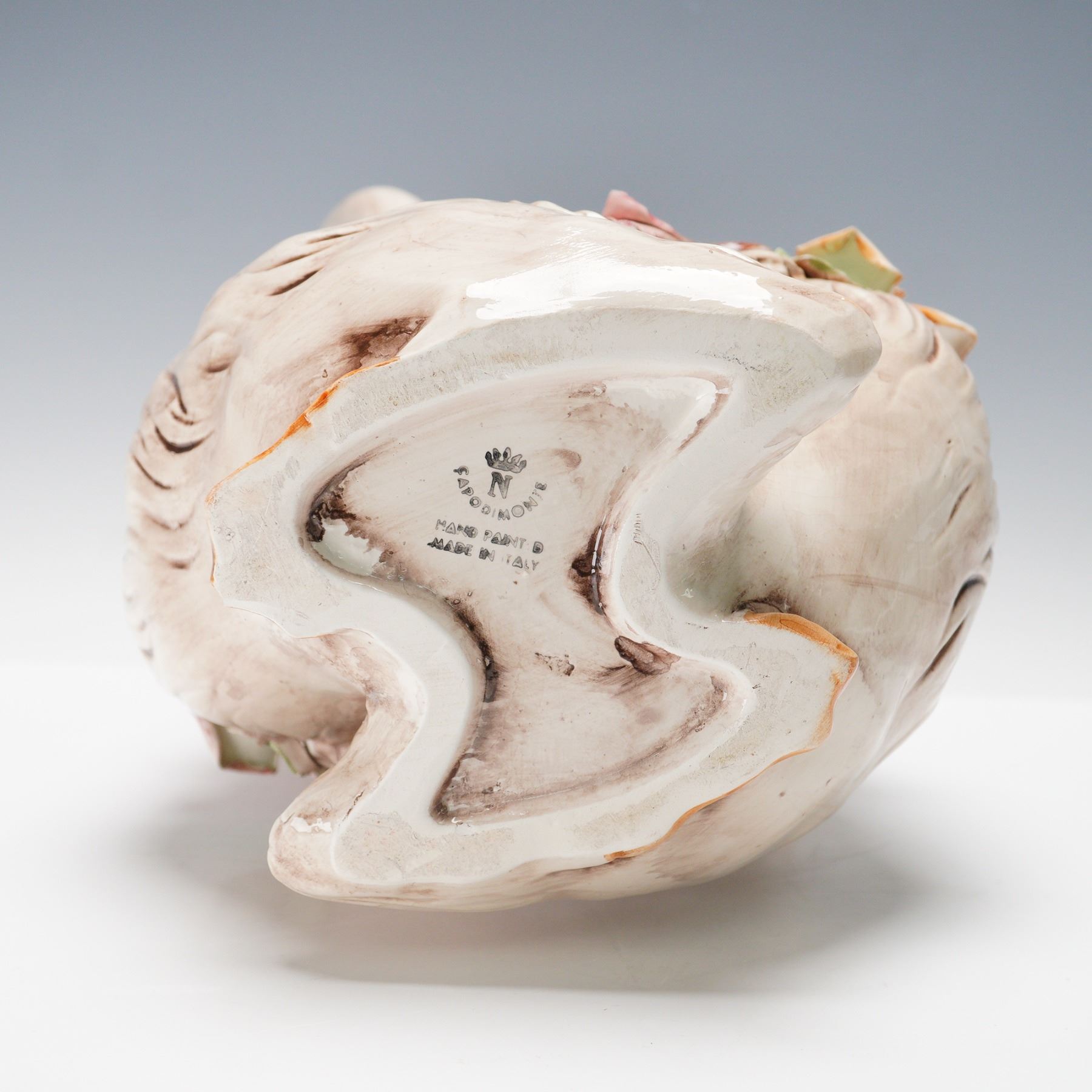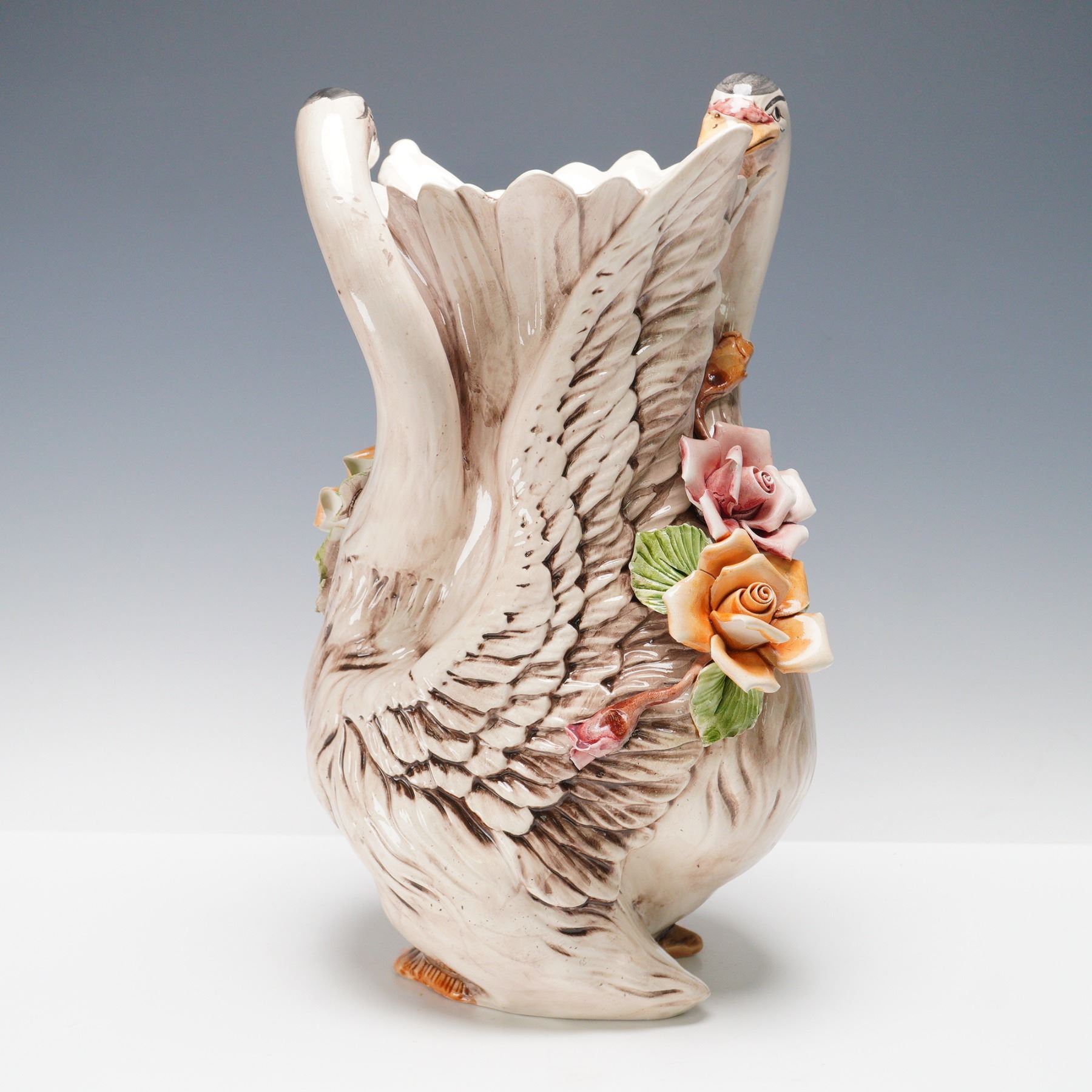 An impressive hand-painted Capodimonte porcelain vase crafted in Italy, depicting a pair of graceful swans forming the body of the vessel. Standing approximately 15 inches tall, this striking piece exemplifies the elegance and craftsmanship for which Capodimonte is renowned. The sculpted swans are rendered in naturalistic tones of cream and soft taupe, their detailed feathers accentuating the flowing form of the vase. Between the swans, a cascade of meticulously modeled roses and leaves in warm shades of peach, pink, and green add a vivid burst of color and texture. Each floral element is individually shaped and applied by hand, showcasing the exceptional artistry of Capodimonte porcelain work. The underside bears the signature crowned "N" Capodimonte mark along with Made in Italy, confirming authenticity and origin. A beautiful example of Italian artistry, this vase makes an elegant centerpiece or decorative statement in any fine home or collection.