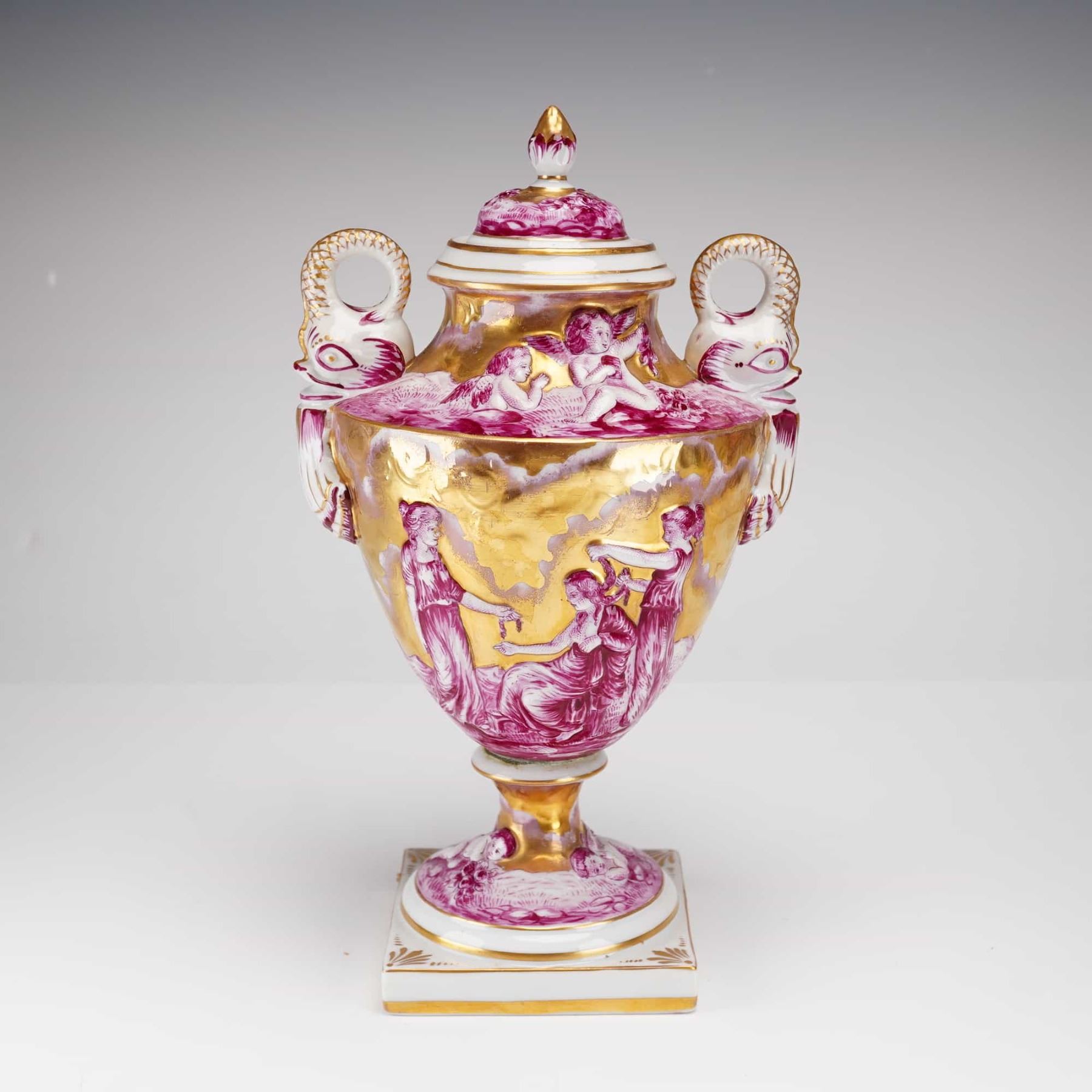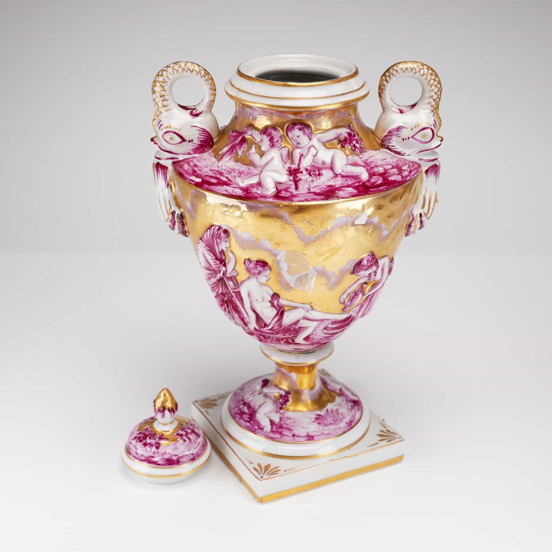 This 19th-century Capodimonte porcelain lidded urn features ornate figural scenes in bas-relief, hand painted and gilded. The hard-paste porcelain vessel is of baluster form, raised on a circular pedestal foot and a square plinth. The decoration consists of classical draped female figures and putti in a puce camaïeu palette against a heavily gilded ground. The urn is flanked by two handles modeled as elephant heads with trunks forming the attachment points. The domed lid is topped with a bud-form finial. The piece is of multi-part construction held together by a central metal bolt. The underside of the base features an underglaze blue crowned N mark.