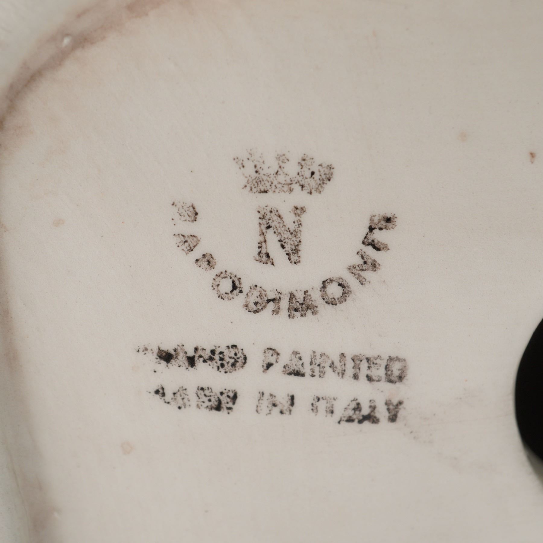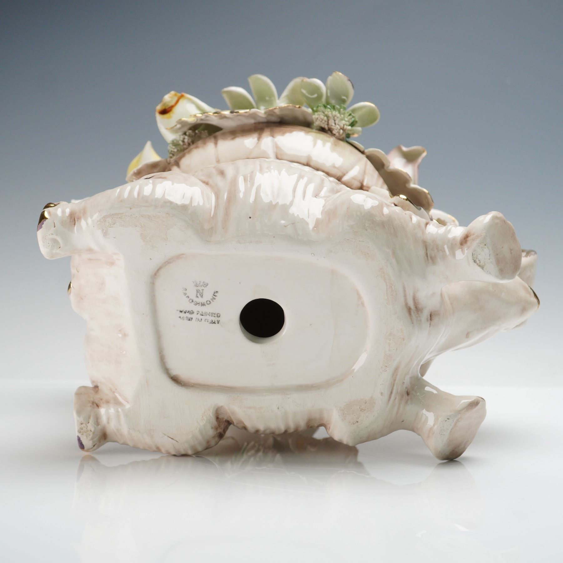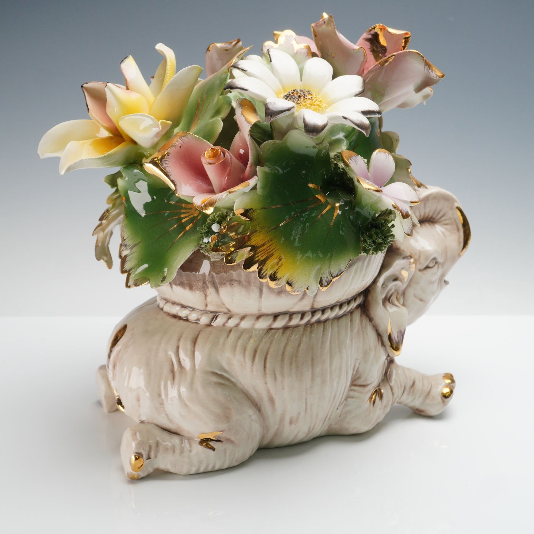 Capodimonte hand painted porcelain figural centerpiece featuring an elephant with a basket of colorful flowers. The flowers are finely detailed in shades of pink, blue, yellow, and green with gilt accents, while the elephant is finished in a pale glaze with gilt highlights. Marked on the underside Capodimonte, Made in Italy, Hand Painted.