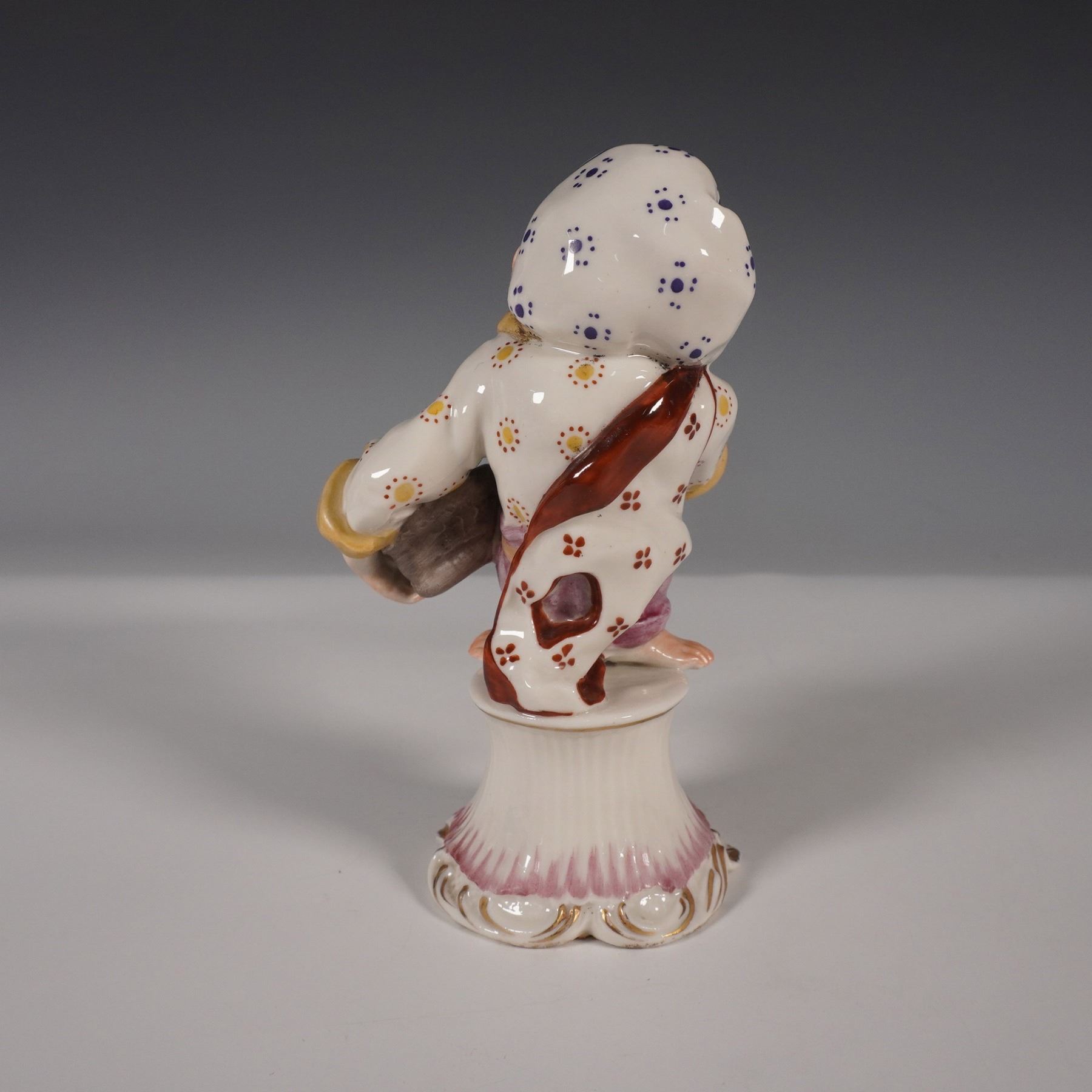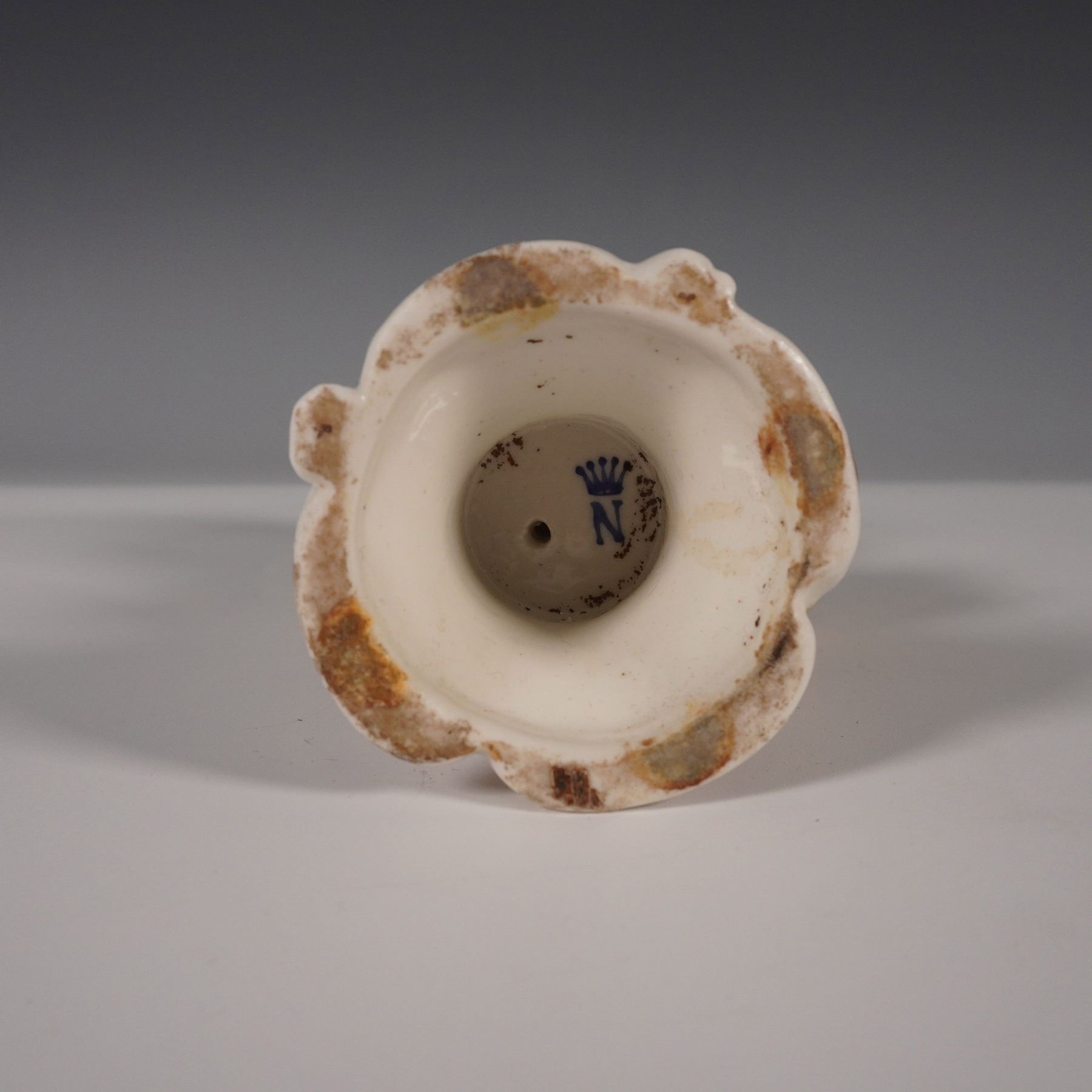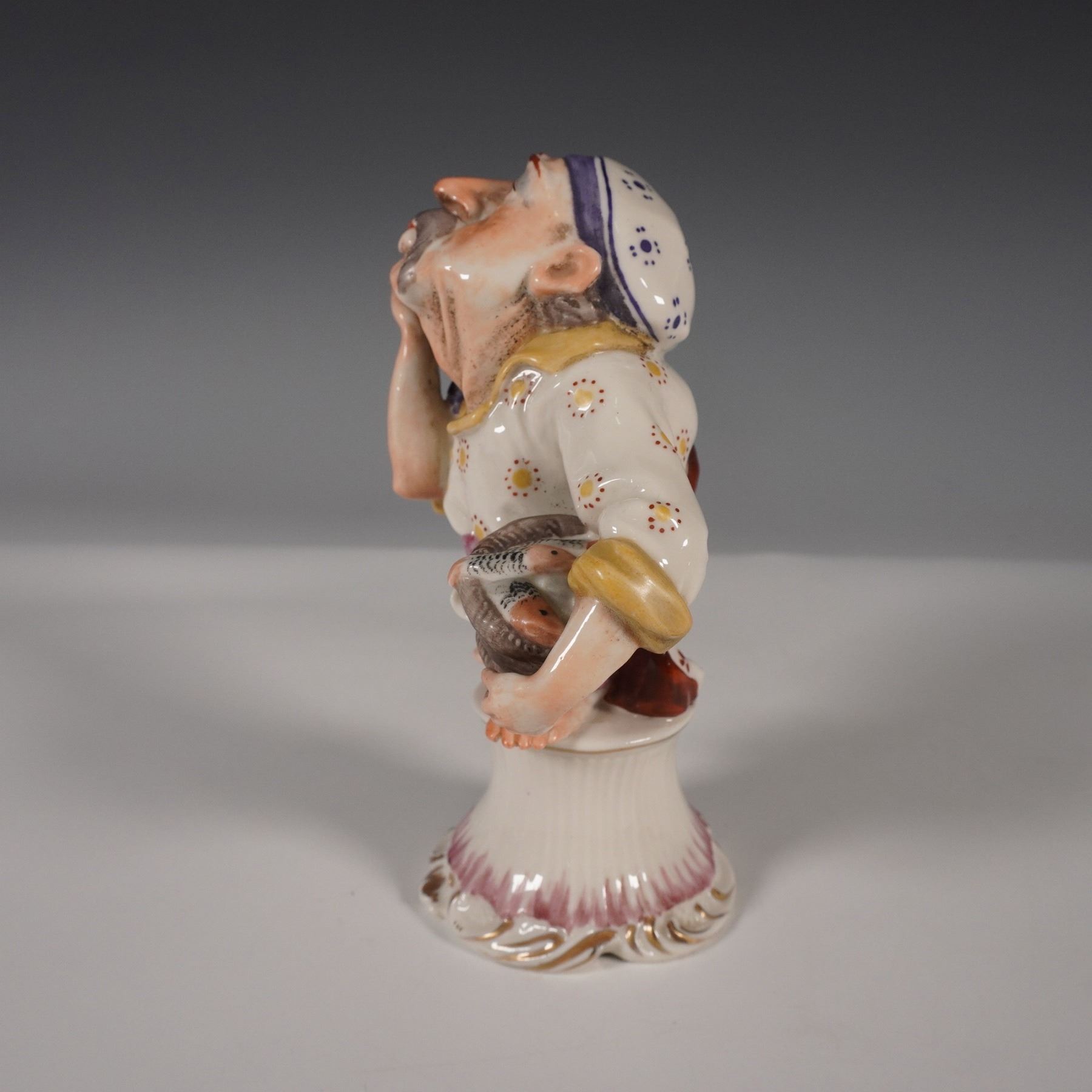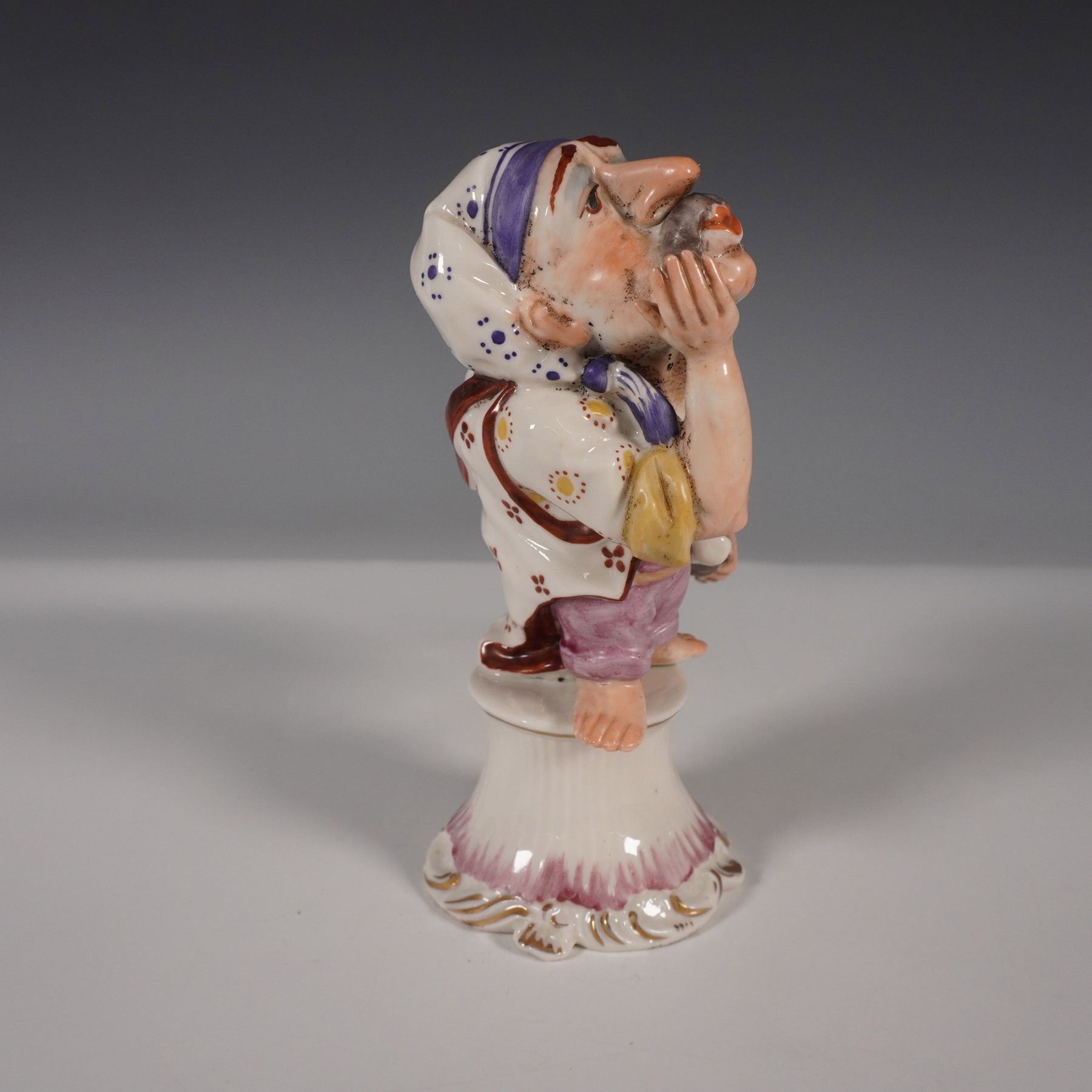 A finely crafted Capodimonte porcelain figurine depicting a bearded man seated on a decorative pedestal, lost in thought while holding a small basket. The figure is dressed in a colorful folk-style outfit with intricate hand-painted details, including a patterned headscarf, a loose-fitting shirt, and rolled-up trousers. The expressive sculpting captures a moment of contemplation, with the man resting his head on one hand. The figurine bears the signature blue "N" Capodimonte mark on the underside.