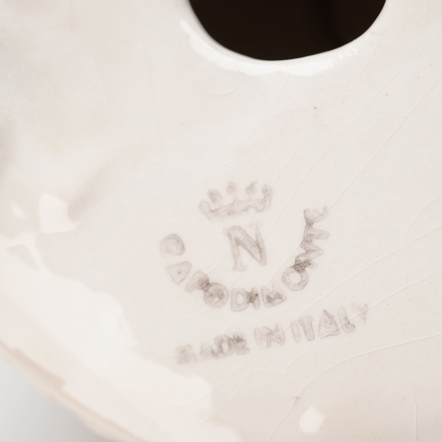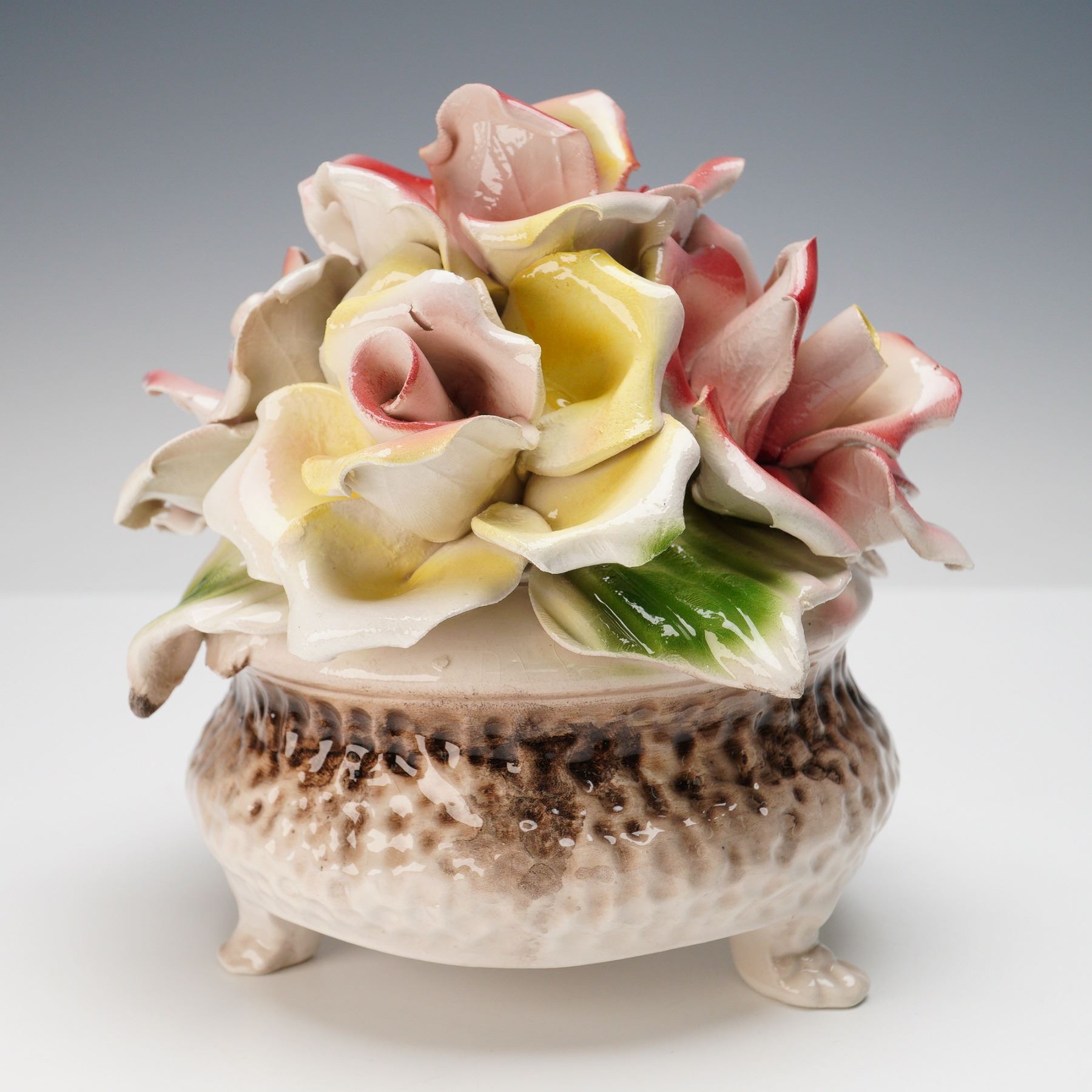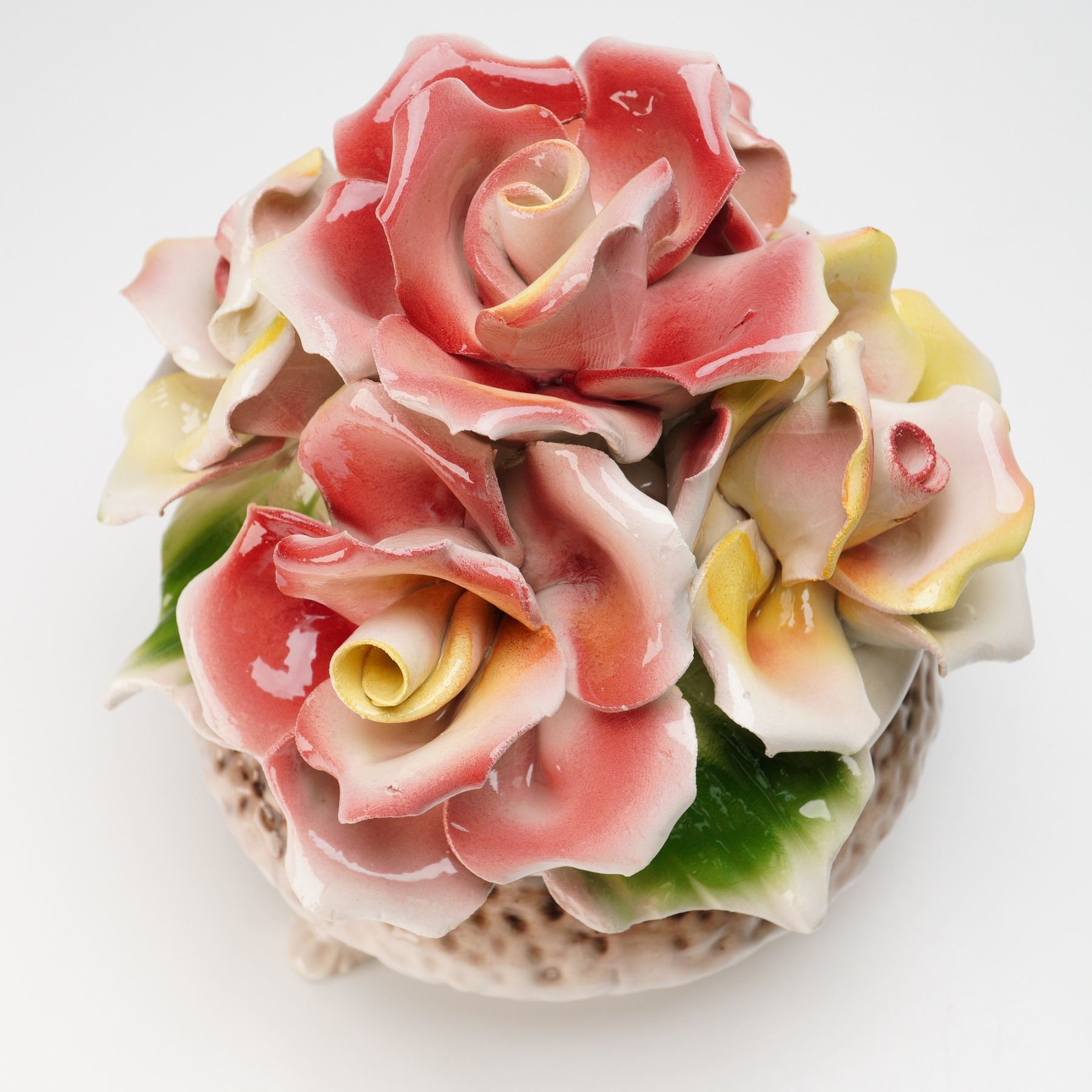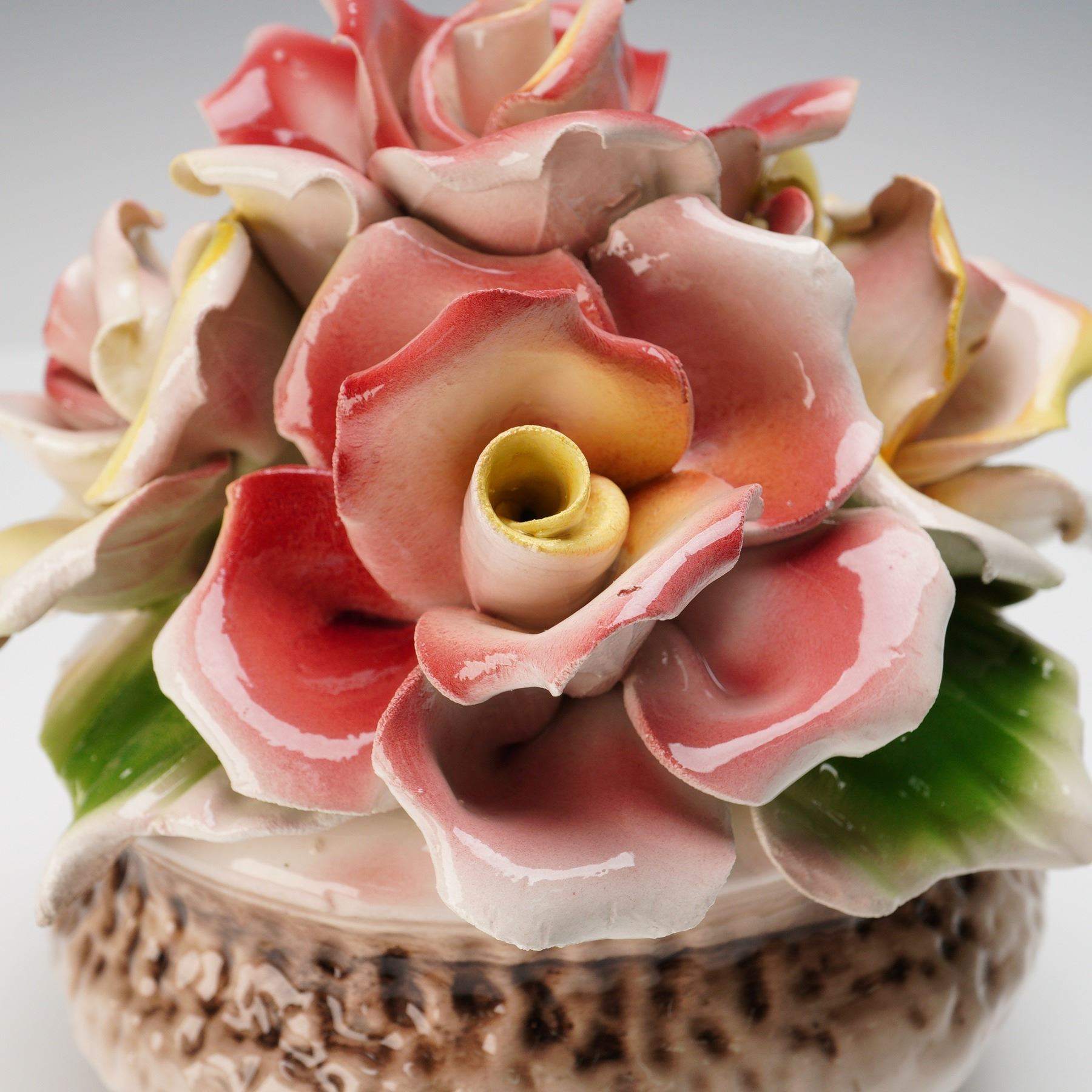 Handcrafted in Italy, this elegant figurine features intricately sculpted and hand-painted roses in delicate pink, yellow, and white hues with green leaves, highlighted with gold trim. The ornate base exhibits a flowing Rococo-inspired form with dual handles. Marked on the underside with the Capodimonte crown "N" mark and "Made in Italy" stamp.