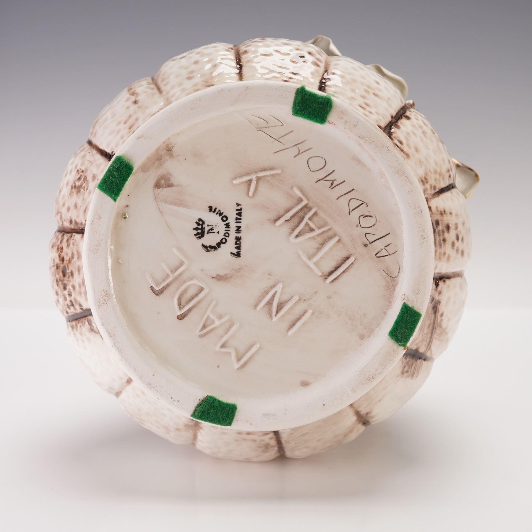 Elegant hand-painted Italian porcelain vase featuring a curvaceous, fluted neck with a scrolled handle and a textured bulbous body in soft beige tones. Adorned with delicate applied porcelain flowers in shades of pink, yellow, and green, showcasing the refined artistry typical of Capodimonte craftsmanship. Marked on the underside with "Capodimonte," "Made in Italy," and the crowned "N" logo stamp.