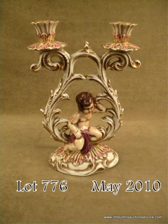 Capodimonte porcelain double candle holder, approx. 12” in height and approx. 8” wide in excellent condition at time of description showing a cherub on base between two vines leading to the candle holders in gold, rose and ivory colors;underside signed “40M”, “Italy”, “Capodimonte” with five lines over N symbol. Est.: $100-$200.
