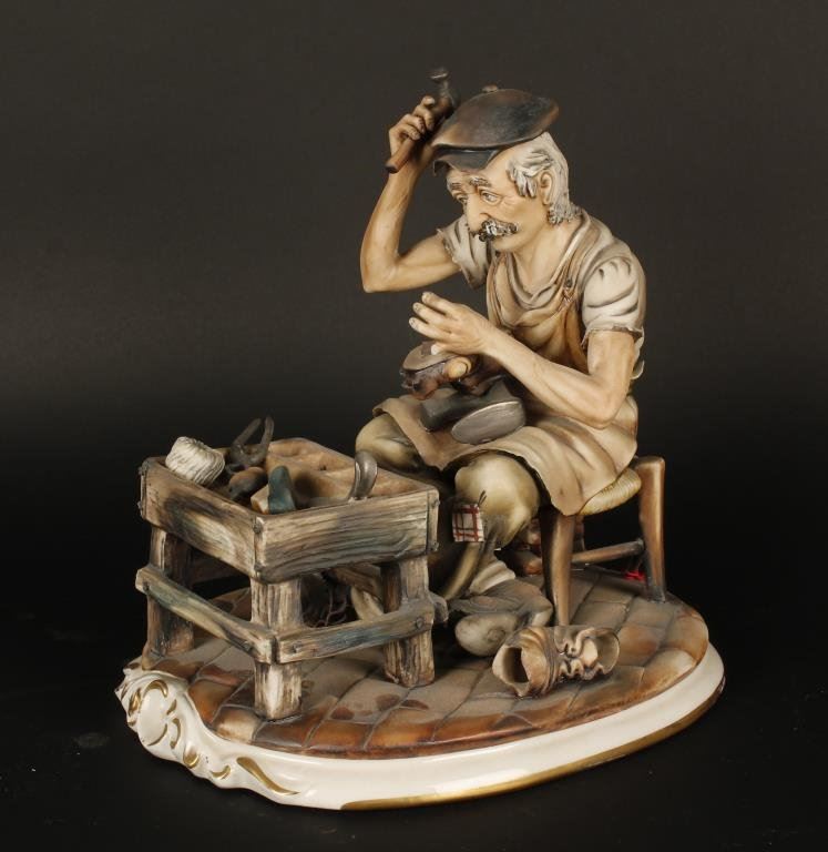 Capodimonte porcelain figure of cobbler at his bench; approximately 9.5” by 10” across base; with tag. Est.: $175-$350.