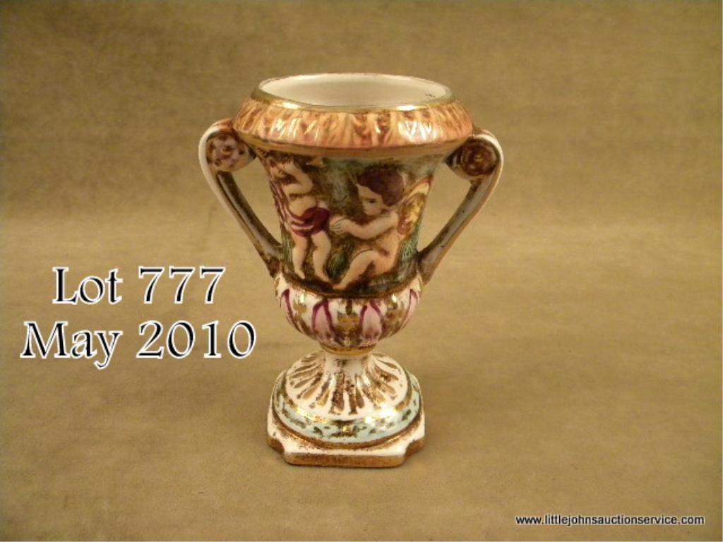 Capodimonte porcelain small vase, approx. 5” high by 4” wide at the top in overall fine condition at time of description; underside of base marked “32 C. PP”, “Capodimonte” and “Made in Italy” with five lines over N symbol; decoration shows angelblowing horns in colors of rose, ivory, brown aqua and pink with gold bordering. Est.: $75-$150.