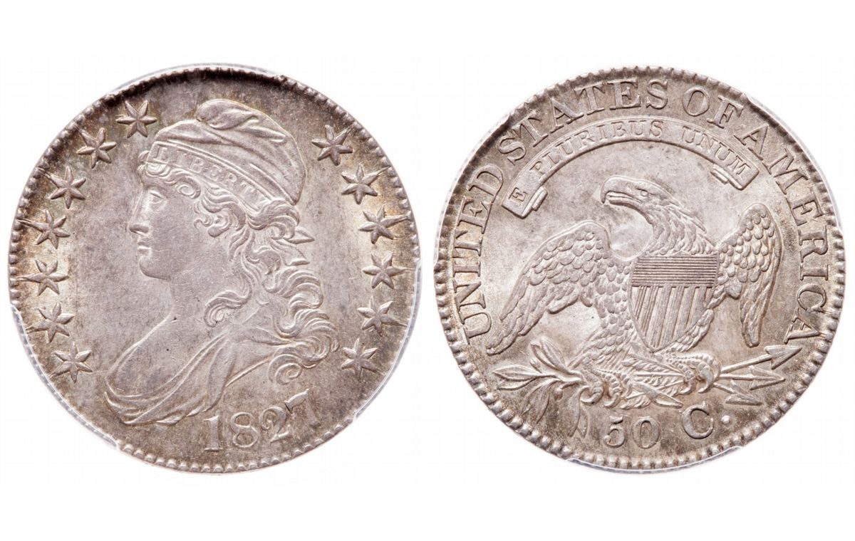 Capped Bust Half Dollar. 1827.Square Base 2. PCGS graded Mint State-62. Medium heavy, multi-hued toning.