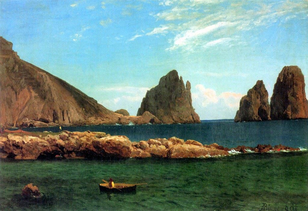Artist: Albert Bierstadt - Title: Capri - Medium: Fine Art Giclee on Canvas - Image Size: Approximately 13.75 inches x 20 inches - Framed: Unframed on Unstretched Canvas - Biography: Bierstadt became internationally renowned for his beautiful and enormous paintings of the newly accessible American west, and his works found their way into public and private collections at staggeringly high prices for his time. His popularity and wealth rose to tremendous heights only to fade as the interest in the Boston School and impressionism turned public taste away from his highly detailed landscapes suffused with golden light. -