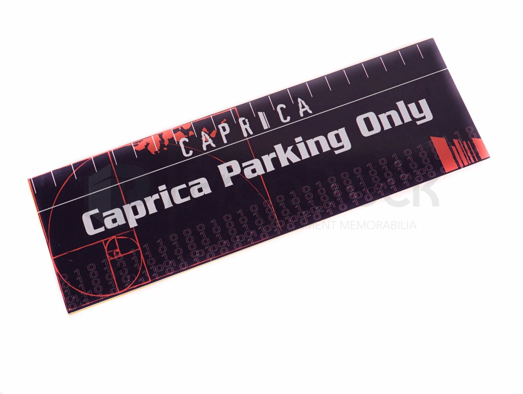 Parking pass used by members of the crew on the science ficiton television show Caprica. These types of placrs allowed the crew to park on set during filming and produciton of the show. Made of plastic, this piece features the shows logo on the front and the lettering "Caprica Parking Only". This piece remains in excellent, production used conditon.