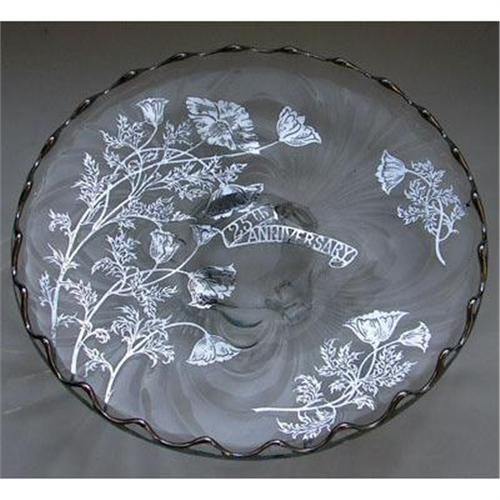 This 11 1/2 inch, four footed, Cambridge Glass, Caprice Caberet crimped plate, catalogue #26. Featuring a Silver City Sterling silver overlay in their Flanders pattern with a SS homage to ones 25th anniversary. Tarnished, due to age and in excellent condition.