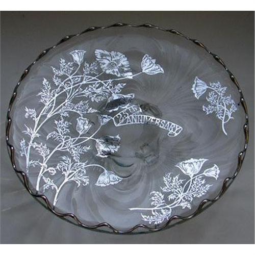 </font></strong>This 11 1/2 inch, four footed, Cambridge Glass, Caprice Caberet crimped plate, catalogue #26. Featuring a Silver City Sterling silver overlay in their Flanders pattern with a SS homage to ones 25th anniversary. Tarnished, due to age and in excellent condition.</font>