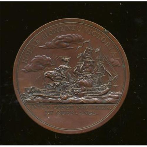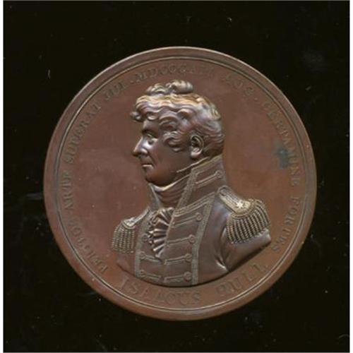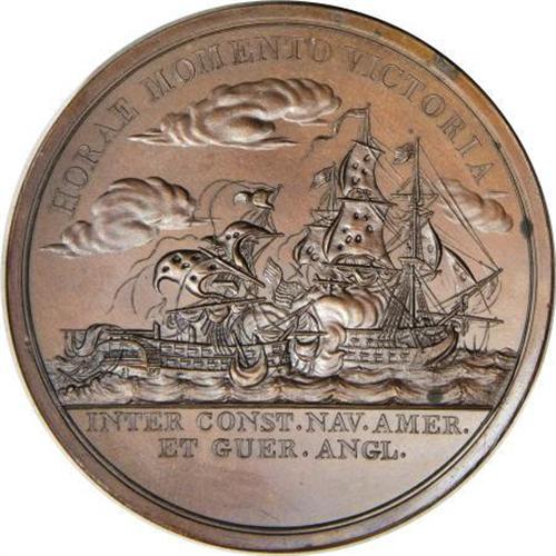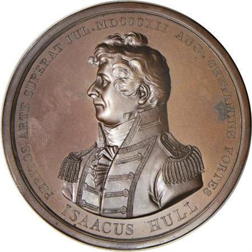 <B>Captain Isaac Hull Naval Medal, Julian-NA-12, MS63 NGC.</B></I> Bronzed copper, 65 mm, 125.9 gm. Dies by John Reich. Obverse bust left, legend around ISAACUS HULL PERITOS ARTE SUPERAT JUL. MDCCCXII [ET] AUG. CERTAMINE FORTES ("Isaac Hull conquers in July 1812 the skilled by stratagem (and) in August the powerful in battle"), R. (for Reich) on truncation. Reverse naval scene, around and in exergue HORAE MOMENTO VICTORIA / INTER CONST. NAV. AMER. ET GUER. ANGL. ("Between the American ship <I>Constitution </B></I>and the English vessel <I>Guerriere</B></I>"<I>). </B></I><BR> This glossy chestnut-brown specimen, from a copper mintage of only 126 pieces, shows much mint luster along with a couple of small, undistracting carbon spots. Comes with an NGC Photo Certificate. An unusual medal with the elusive John Reich signature. Julian's Mint medals reference relates that Reich was paid $800 for the dies. An example in the Kessler-Spangenberger sale (NASCA, 4/1981, lot 1701), Choice Unc., brought $400 against a presale estimate of $75.<BR><BR><b>Shipping:</b> Coins & Currency (<a target="_blank" href="http://www.heritageauctions.com/common/shipping.php">view shipping information</a>)
