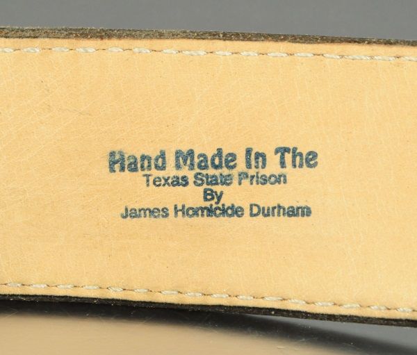 Life member, black leather belt with gold and silver plate buckle. Belt stamped "Hand Made In The Texas State Prison by James Homicide Durham". Belt measures 43 1/2" long, buckle measures 4 1/2" x 3 1/2".