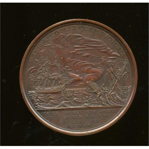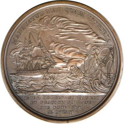 <B>Captain James Lawrence Naval Medal, Julian-NA-14, MS64 NGC.</B></I> Bronzed copper, 65 mm, 157.2 gm. Dies by Moritz Furst. Obverse bust right, legend around JAC. LAWRENCE DULCE ET DECORUM EST PRO PATRIA MORI ("James Lawrence it is sweet and fitting to die for one's country"), FURST.F. below bust truncation. Reverse legend around and in exergue MANSUETUD MAJ QUAM GLORIAM / INTER HORNET NAV AMERI ET PEACOCK NAV ANG DIE XXIV FEB MDCCCXIII ("Clemency greater than victory / Between the American vessel <I>Hornet </B></I>and the English warship <I>Peacock </B></I>February 24, 1813"), FURST.F. on exergual line.<BR> This piece is a delightfully lustrous brick-red specimen with minimal distractions and prooflike surfaces throughout. Comes with NGC Photo Certificate. Lot 1703, a "sharp AU" in the famed Kessler-Spangenberger sale (NASCA, 4/1981) brought $300 against a presale estimate of $125. The present near-Gem should fetch much more.<BR><BR><b>Shipping:</b> Coins & Currency (<a target="_blank" href="http://www.heritageauctions.com/common/shipping.php">view shipping information</a>)
